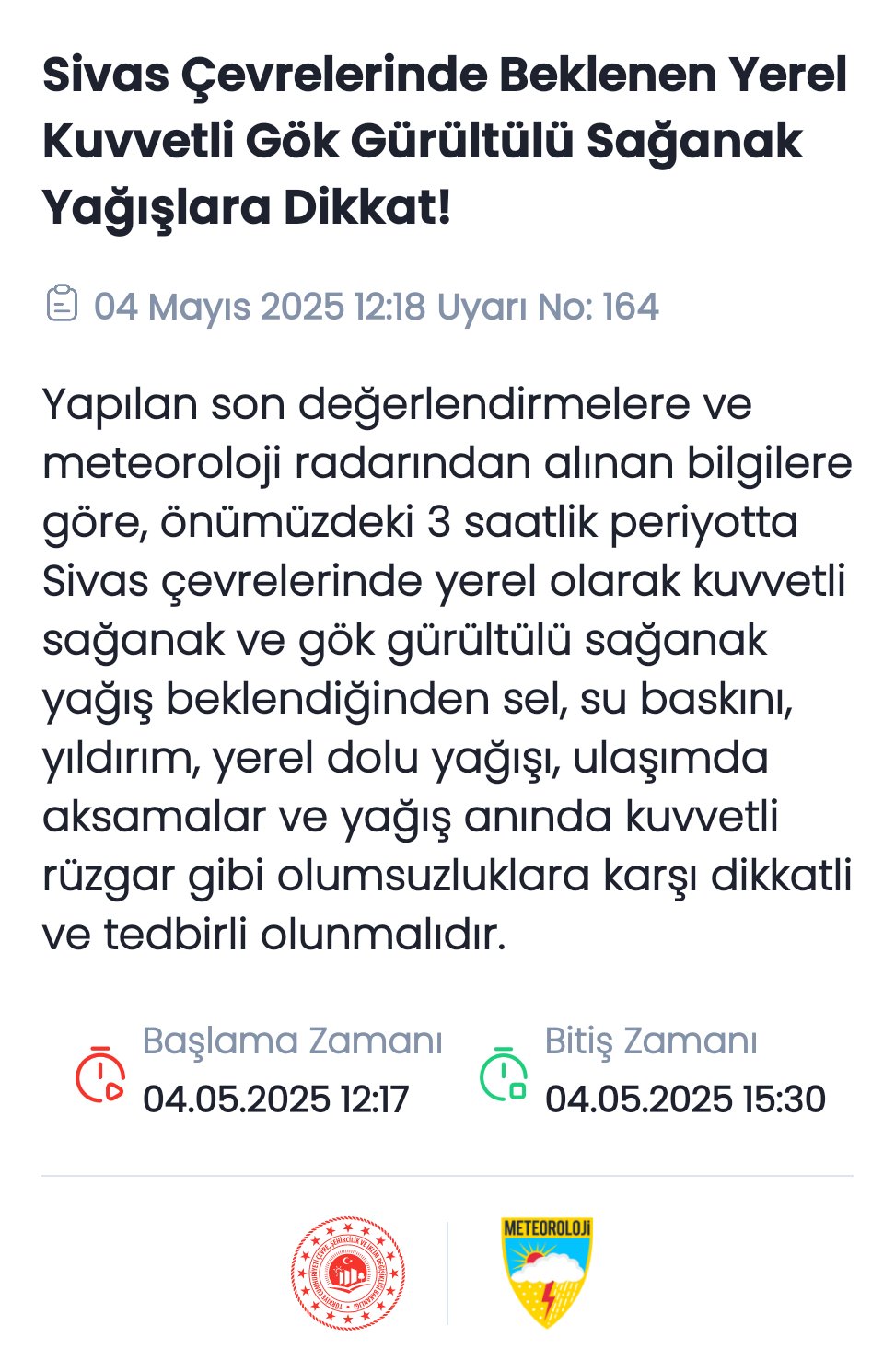 164 numarasıyla yayınlanan ve 04 Mayıs 2025 Pazar günü saat 12:17'de başlayan uyarının, saat 15:30'a kadar geçerli olacağı bildirildi. Bu süre zarfında vatandaşların dikkatli ve tedbirli olması büyük önem taşıyor.