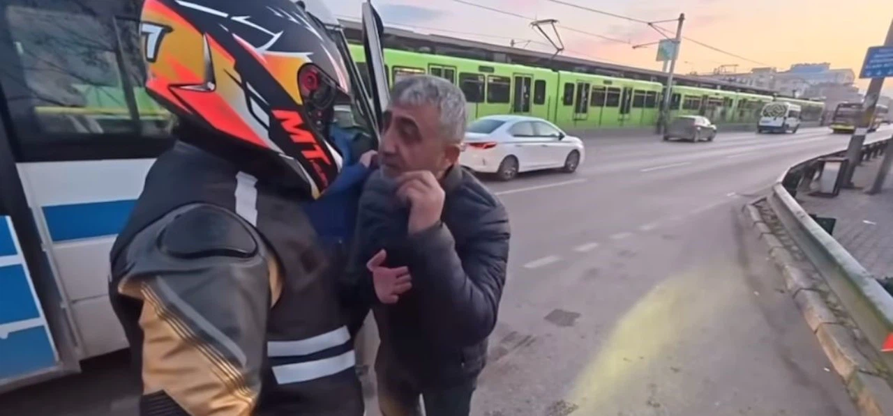 Bursa'da seyir halindeki motosikletli, önüne kırdığını iddia ettiği minibüs şoförüne 'lan' diye hitap edince sürücü adeta deliye döndü.