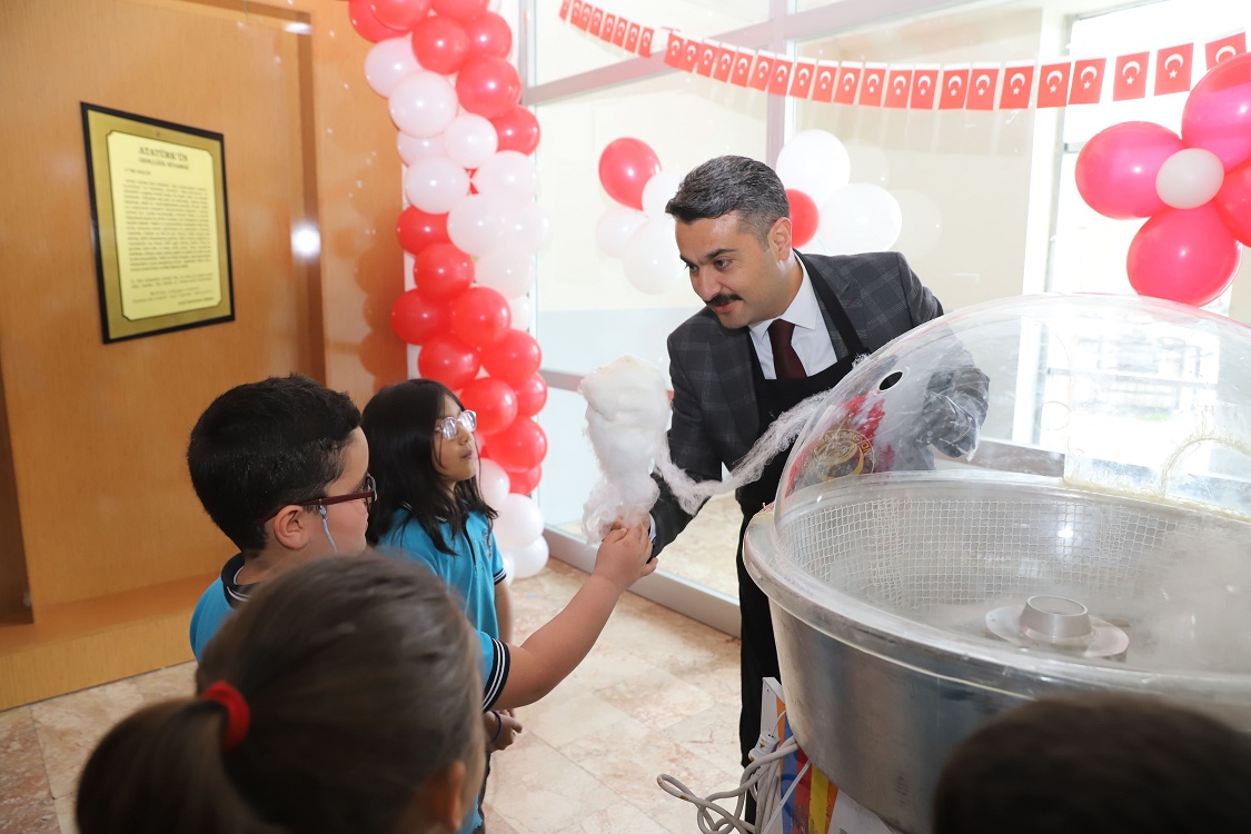 23 Nisan Ulusal Egemenlik ve Çocuk Bayramı kutlamaları Sivas'ta renkli görüntülerle devam ediyor. Lütfi Fikret Tuncel İlkokulu/Ortaokulu'nda düzenlenen "Pamuk Şekeri Günü" etkinliğine katılan İl Millî Eğitim Müdürü Fatih Erdoğan, pamuk şeker makinesinin başına geçerek çocuklara kendi elleriyle pamuk şekeri yapıp ikram etti.