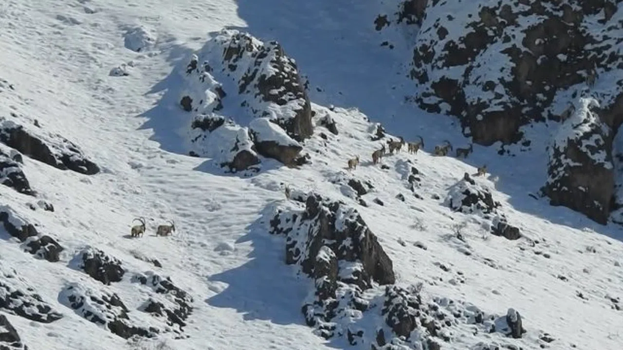 Erzincan'da zirvesi karla kaplanan 3300 rakımlı Munzur Dağlarında göç yoluna koyulan yaban keçileri görüntülendi.