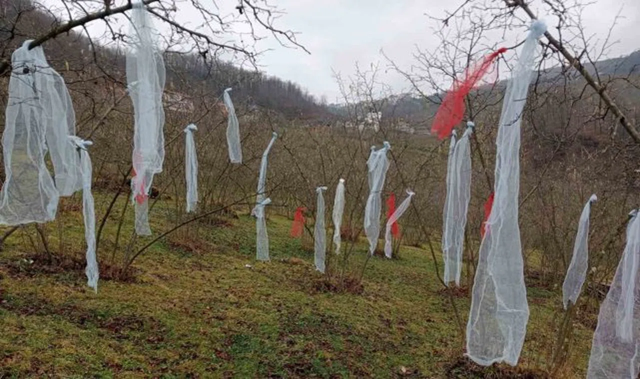 Ordu'nun Korgan ilçesinde yaşayan 55 yaşındaki Hikmet Ayba, hem yeni yıl için çam ağacı süsleyenlere, hem de fındık fiyatlarına tepki göstermek adına fındık bahçesini süsledi.