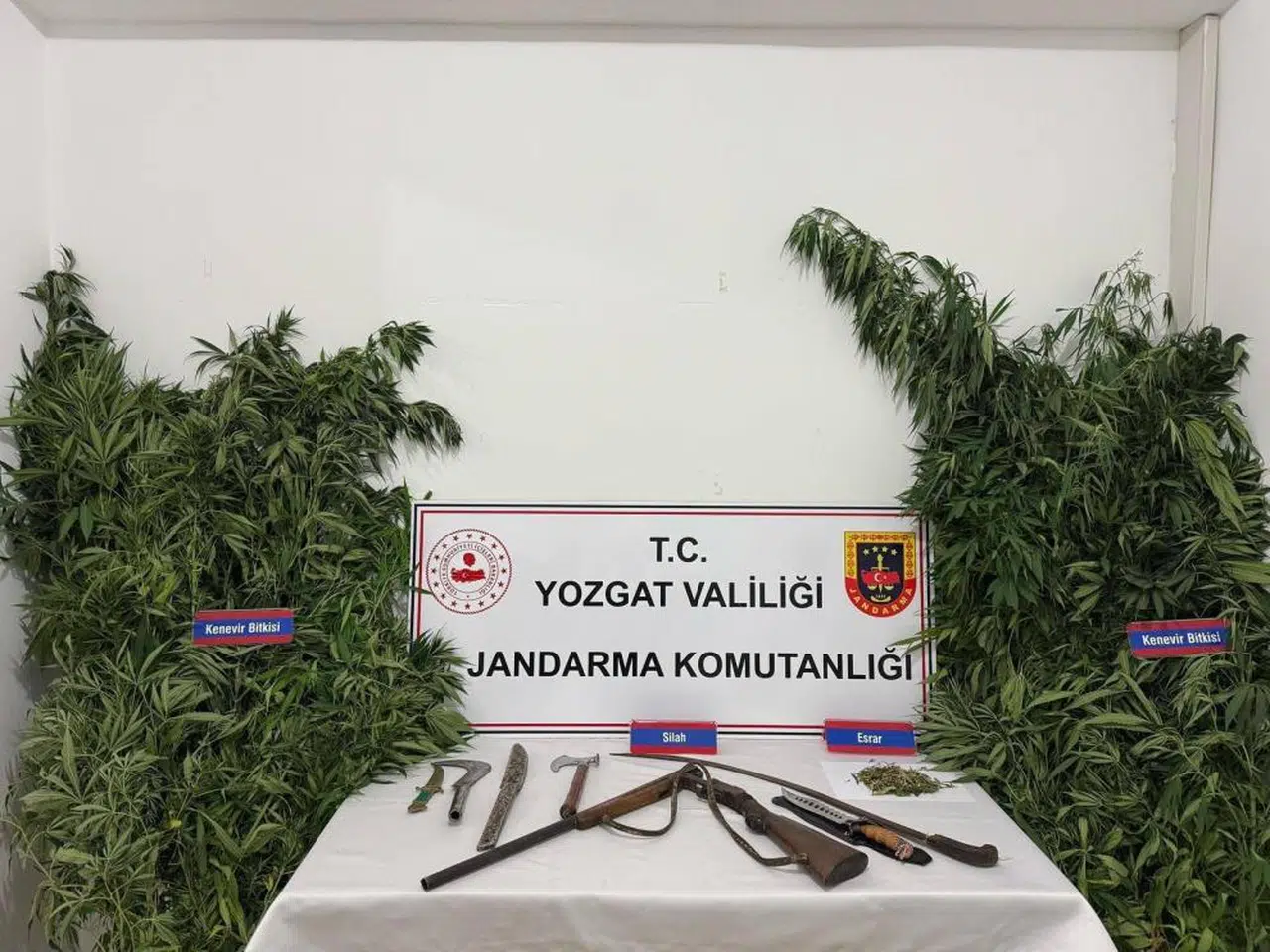 Belirlenen adrese yapılan baskında bahçede 243 kök kenevir bitkisi bulundu. Ayrıca aramalarda 5 gram kubar esrar, 1 adet yivsiz av tüfeği, 2 adet tahra, 1 balta, 1 kılıç, 1 kama ve 1 bıçak da ele geçirildi. Operasyonun ardından ele geçirilen tüm malzemelere el konuldu.