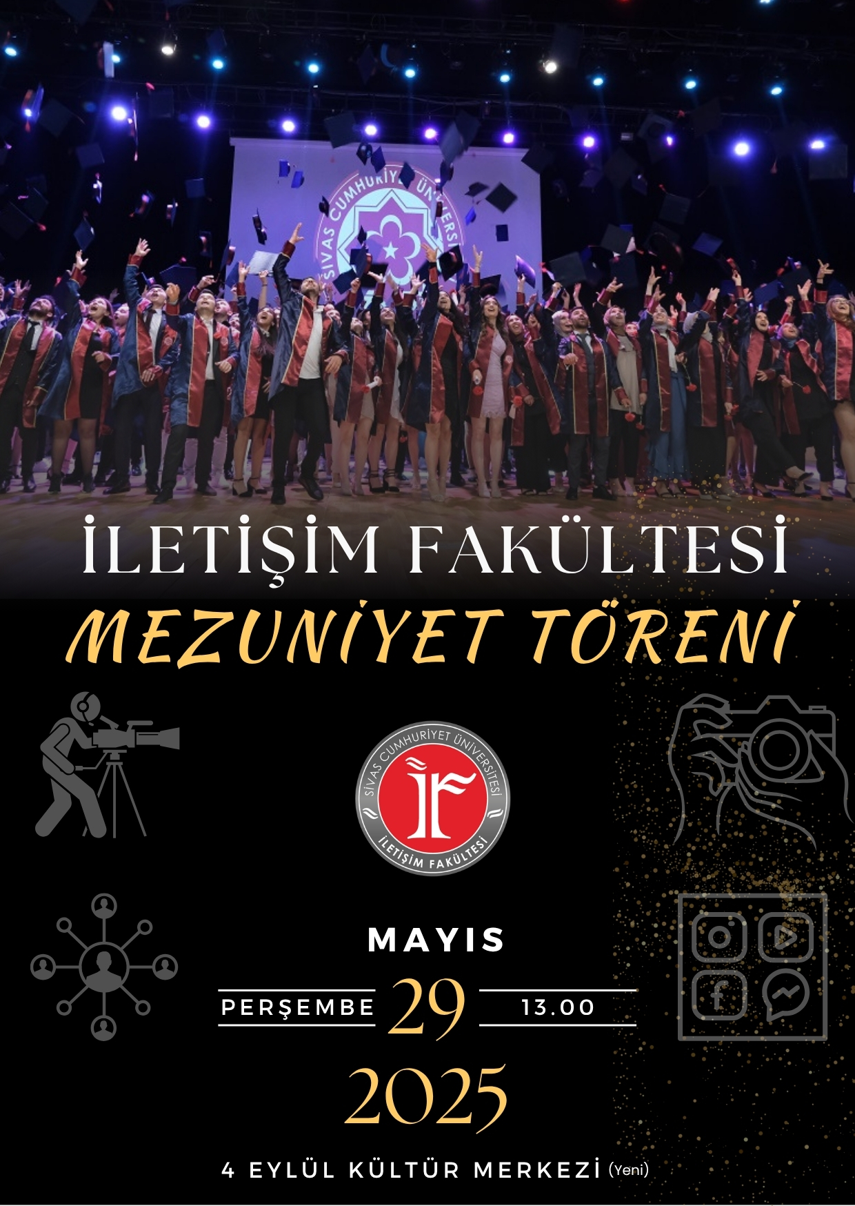 Sivas Cumhuriyet Üniversitesi İletişim Fakültesi tarafından organize edilen mezuniyet töreni, yarın saat 13.00'te Yeni 4 Eylül Kültür Merkezi'nde yapılacak. Geleceğin gazetecileri, halkla ilişkiler uzmanları, radyo-televizyon ve sinemacıları ile görsel iletişim tasarımcılarının meslek hayatlarına uğurlanacağı bu anlamlı törene, öğrencilerin aileleri, üniversite yönetimi, akademisyenler ve çok sayıda davetlinin katılması bekleniyor.