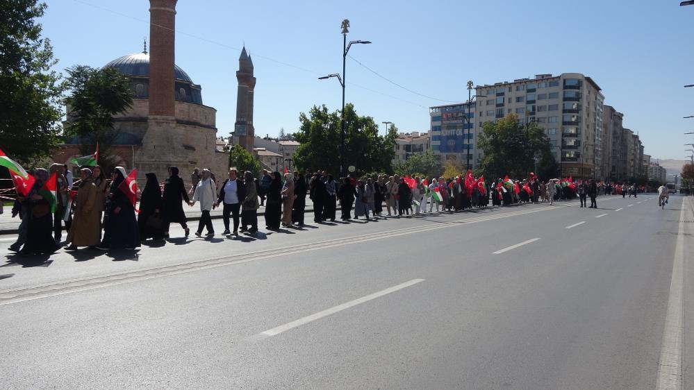 Etkinlik için Sivas Devlet Hastanesi önünde bir araya gelen kadınlar, dikkat çekici bir eyleme imza attı. Tek sıra halinde, el ele tutuşarak yaklaşık 1 kilometrelik dev bir zincir oluşturan katılımcılar, zulme karşı omuz omuza duruşlarını sergiledi. Ellerinde Türk bayrağı ve Filistin bayrakları taşıyan grup, özellikle "Barış kadınla mümkün" yazılı pankartlarıyla uluslararası kamuoyuna yönelik kritik bir mesaj verdi. Yürüyüş, şehrin kalbi olan Kent Meydanı'nda son buldu.