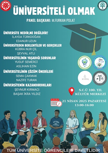 M. Furkan Polat'ın başkanlığında, SCÜ 100. Yıl Kültür Merkezi'nde saat 13:00 ile 16:00 arasında gerçekleştirilecek olan panel, üniversite hayatını doğrudan yaşayan öğrencilerin deneyimlerini ve düşüncelerini paylaşması açısından önem taşıyor. Akademisyenlerden değil, bizzat öğrencilerden oluşan konuşmacılar, üniversiteye dair merak edilenleri samimi bir dille anlatacak.