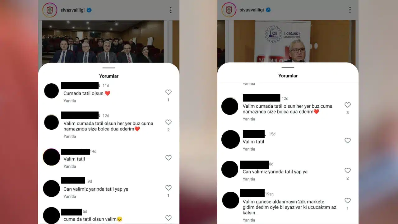 Sivas Valiliği'nden yapılan paylaşımın altına, "Valim Cuma'da tatil olsun her yer buz Cuma namazında size bolca dua ederim. Valim tatil. Can valimiz yarın da tatil yap. Valim güneşe aldanmayın 2 dakika markete gidiyim dedim öyle bir ayaz var ki uçacaktım az kalsın." şeklinde yorumlar yapıldığı görüldü.