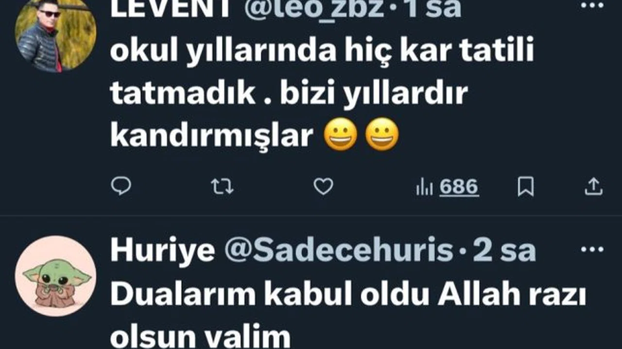 Kayseri'de gece saatlerinde etkisini gösteren kar yağışı nedeniyle kent genelinde okullar 1 gün tatil edildi. Sosyal medya hesabından tatili duyuran Kayseri Valisi Gökmen Çiçek'in paylaşımına öğrenciler tarafından yapılan yorumlar ise güldürdü. 'Canımız Valimiz', 'Valim çok büyük adamsınız', 'Dualarım kabul oldu, Allah razı olsun valim', 'Sağ olun Valim, yarın TYT matematik bitireceğim sayenizde', 'Baba ya baba' gibi yorumlar yapan öğrencilerin sözleri güldürdü.