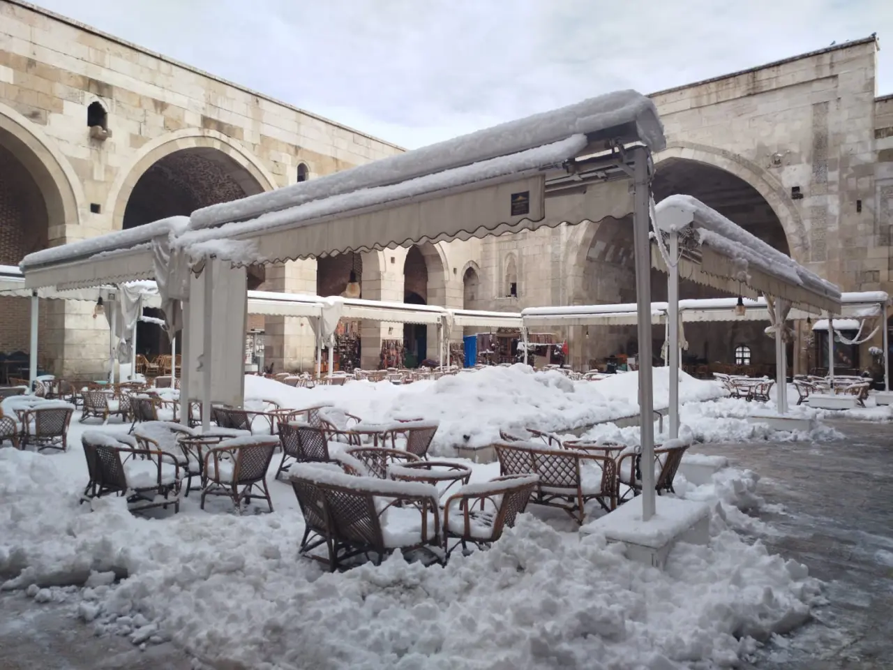 Hava sıcaklıklarının düşmesiyle birlikte yağan kar, Şifaiye Medresesi’nin taş duvarlarını ve avlusunu beyaz bir örtüyle kapladı. Bu görüntü, medreseye hüzünlü ama bir o kadar da etkileyici bir güzellik kazandırdı. Revaklarda yankılanan insan seslerinin yerini rüzgârın uğultusu alırken, tarihi yapının yüzlerce yıllık geçmişi bu sessizlikte daha güçlü hissediliyor. Kış aylarında ziyaretçi sayısının azalması, medreseyi görmek isteyenler için daha sakin ve dingin bir deneyim sunuyor.