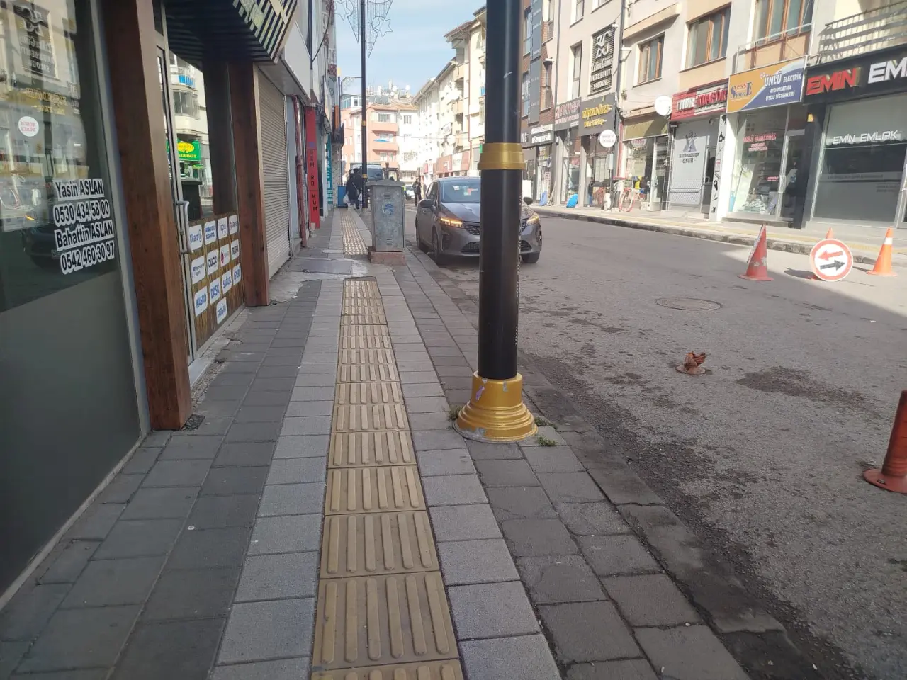 Görme engelliler için hayati öneme sahip olan bu sarı şeritler , bir kılavuz görevine göre piyasada güvenli bir şekilde sunulmak üzere kullanılıyordu. Ancak Sivas'ın yayalarının yoğun bölgelerde olduğu dahi, kılavuz çizginin tam ortasında veya bitişiğine konumlandırılmış sabit yapılara dikkat çekiyor.