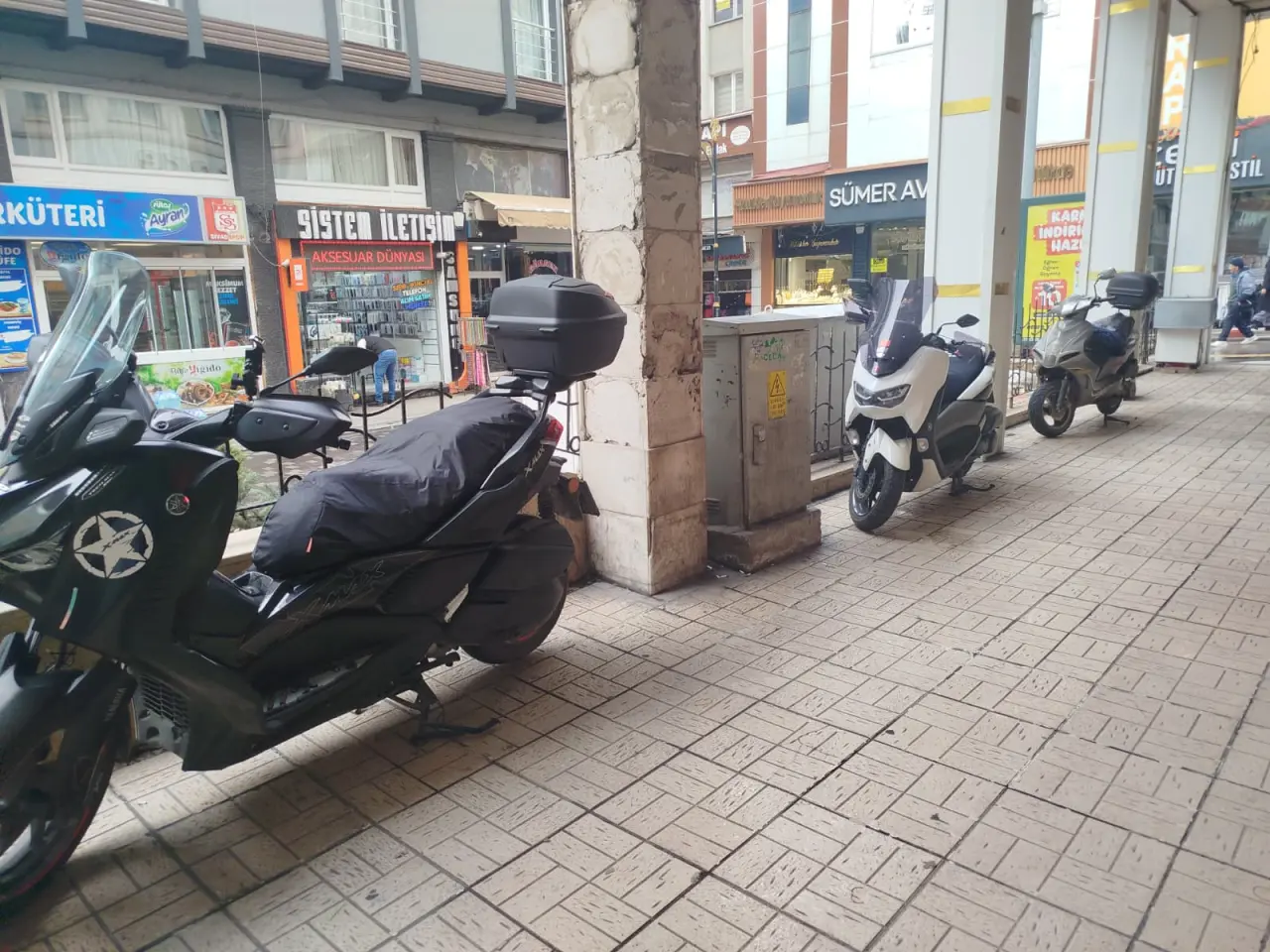 Cadde üzerinde boşluk bulunan alanlara, bina önlerine ya da kaldırımlara yakın yerlere park edilen motosikletler, hem görüntü açısından hem de kullanım alanı bakımından dikkat çekiyor. Bu durum, yoğun yaya trafiğinin olduğu saatlerde daha belirgin bir hal alıyor.