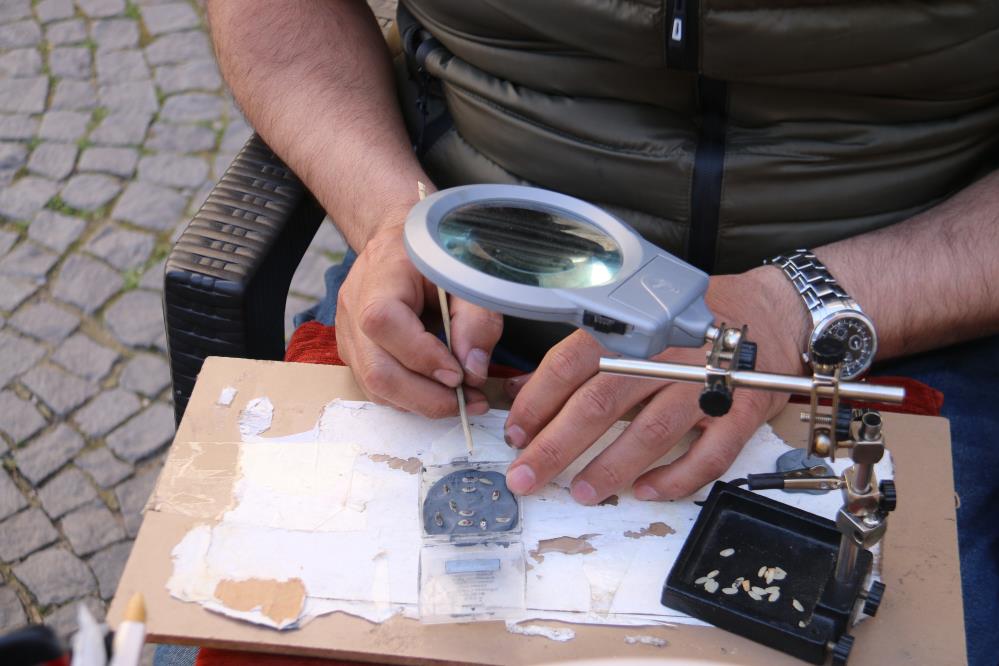 Kaligrafi sanatçısı Selçuk Yıldız, Sivas'ın tarihi kent meydanında kurduğu seyyar tezgâhında yemeklik pirincin üzerine kişiye özel simgeler ve kentin tarihi mekânlarını resmediyor. Yıldız, ilk olarak porselen tabaklar ve ahşap üzerine çizdiği Sivas'ın tarihi mekânlarını şimdi mikroskop ve kendi geliştirdiği kalemler ile pirincin üzerine resmediyor.