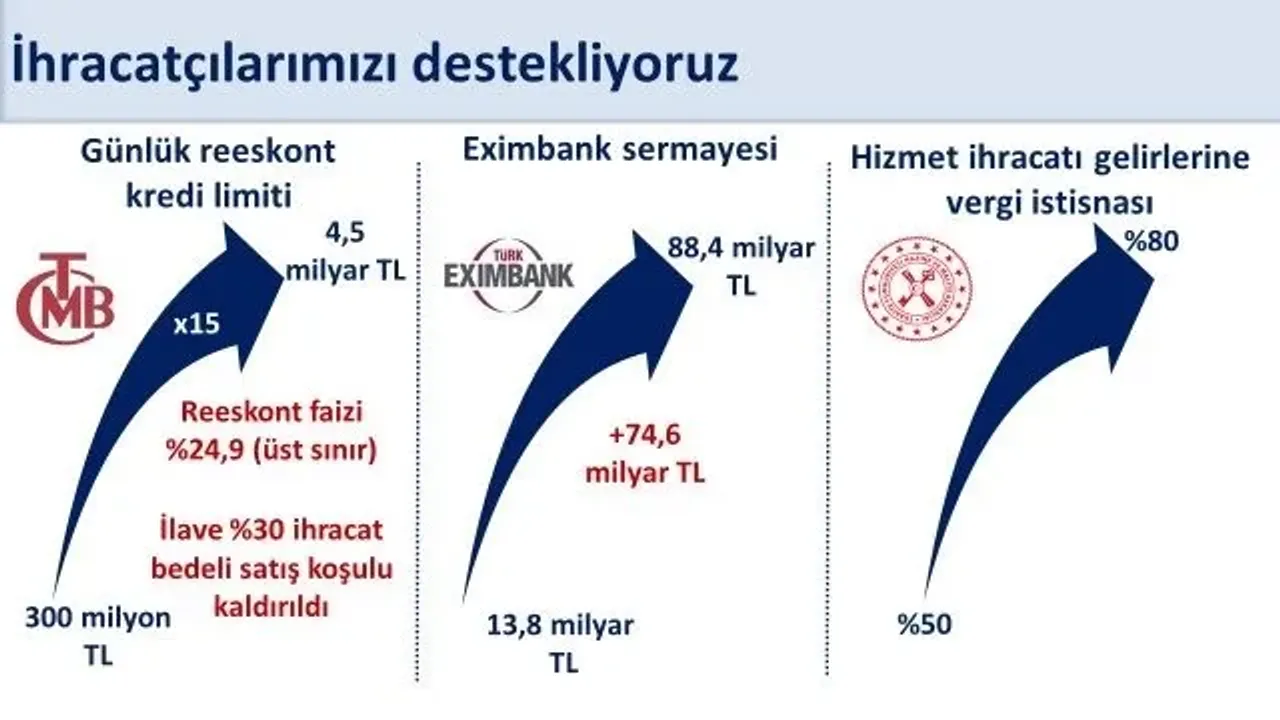 Bakan Şimşek, sadece reeskont limitleriyle kalmayıp, Türkiye İhracat Kredi Bankası A.Ş. (Eximbank) tarafında da önemli iyileştirmeler yapıldığını bildirdi. Yabancı para reeskont toplam limitinin 1 milyar dolara çıkarıldığını belirten Şimşek, Eximbank'ın sermayesinin de 5 kattan fazla bir artışla 88,4 milyar liraya ulaştığı bilgisini verdi.
