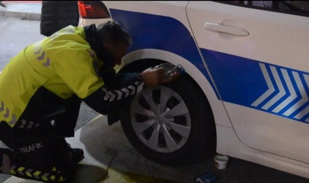 Giresun'da polis aracının motoruna giren kediyi kurtarmak için trafik polisleri seferber oldu.