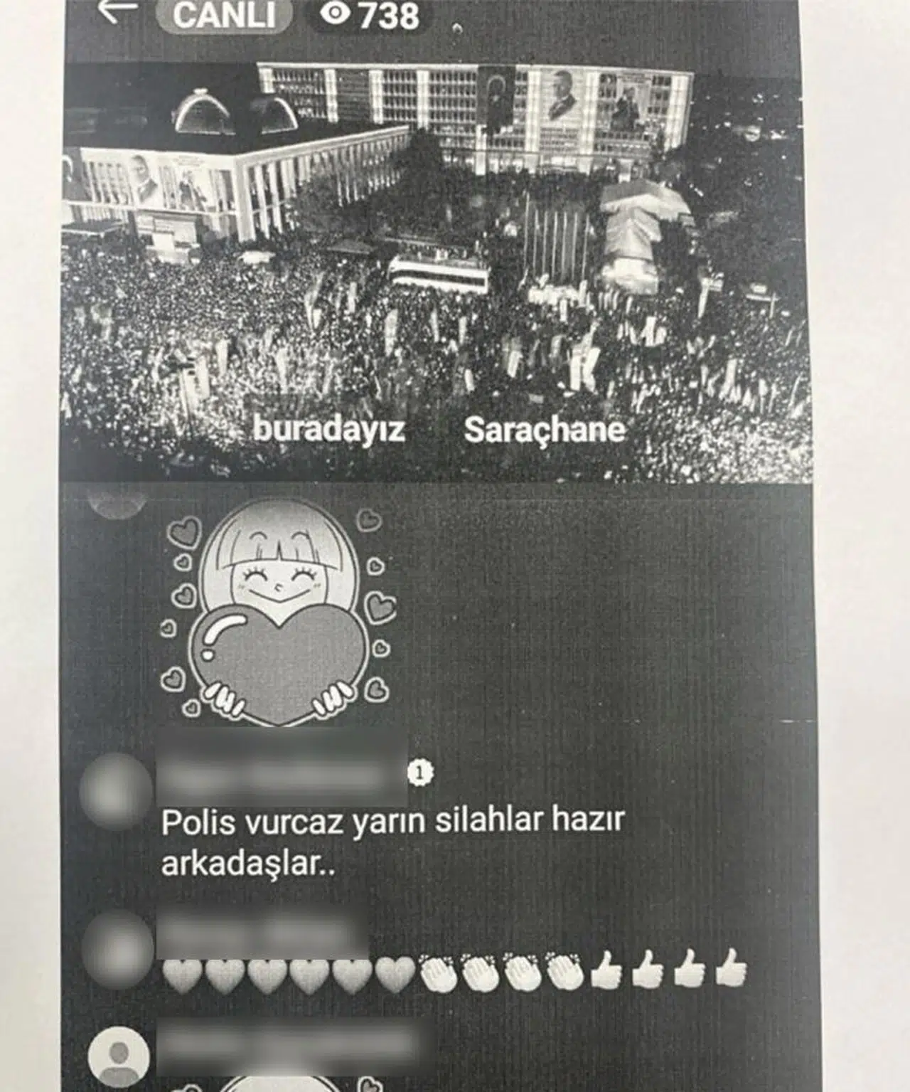 Edinilen bilgiye göre, Siber Suçlarla Mücadele Şube Müdürlüğü ve Güvenlik Şube Müdürlüğünce koordineli olarak sosyal medya platformları üzerinden 'Halkı Kin ve Düşmanlığa Tahrik ve Suç işlemeye Tahrik' suçları kapsamında yapılan provokatif paylaşımlarla ilgili çalışma gerçekleştirildi. Yapılan çalışmalarda; 'Polis vuracağız yarın silahlar hazır arkadaşlar' şeklinde sosyal medyada paylaşım yapan O.K. (43) tespit edilerek gözaltına alındı. Ayrıca tespiti yapılan Ç.A., A.K., M.M.T., C.Ö., V.Y.Ç., A.C.A., S.K, T.F. yakalanarak haklarında 'Halkı Kin ve Düşmanlığa Tahrik' suçlarından gerekli adli işlemler başlatıldı.