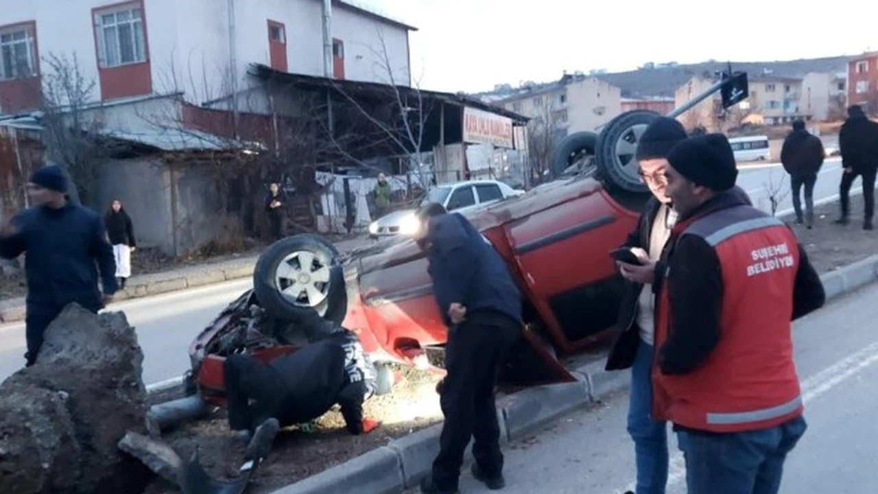 Sivas"ın Suşehri ilçesinde refüje çıkıp aydınlatma direğine çarptıktan sonra ters dönen otomobilin sürücüsü yaralandı.