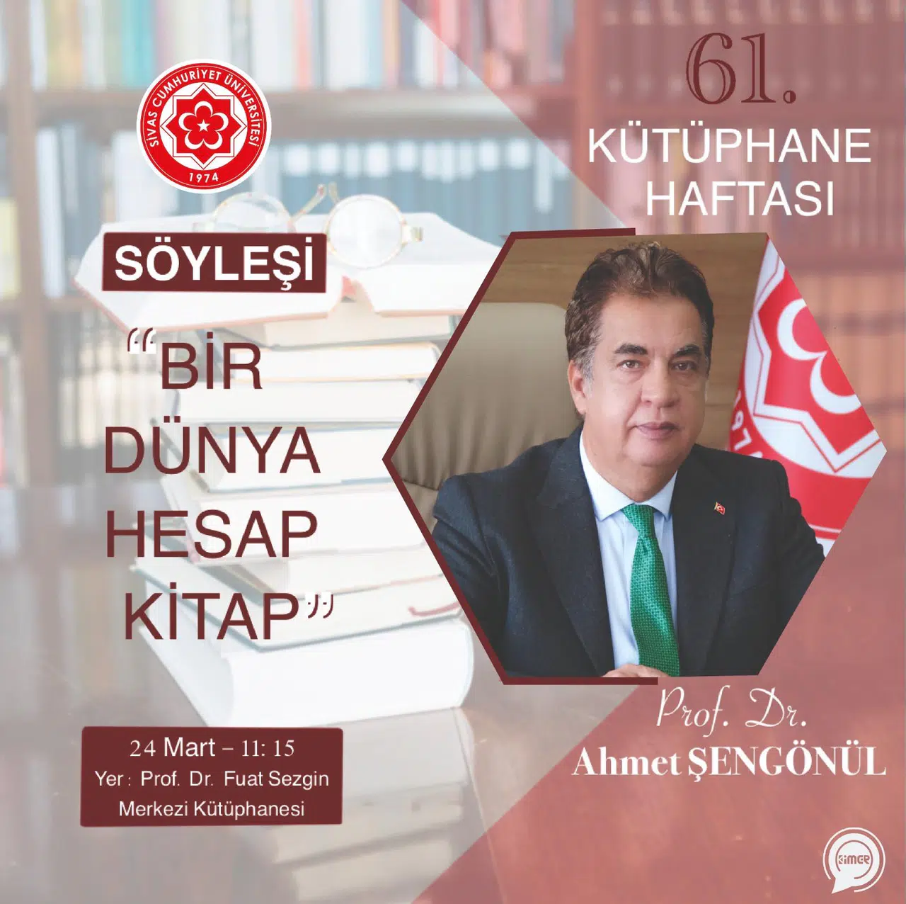 Sivas Cumhuriyet Üniversitesi Rektörü Prof. Dr. Ahmet Şengönül, 61. Kütüphane Haftası etkinlikleri kapsamında öğrencileriyle buluşacak. Prof. Dr. Ahmet Şengönül, 24 Mart 2025 Pazartesi günü saat 11.15'te Prof. Dr. Fuat Sezgin Merkezi Kütüphanesi'nde "Bir Dünya Hesap Kitap" konulu söyleşi gerçekleştirecek.