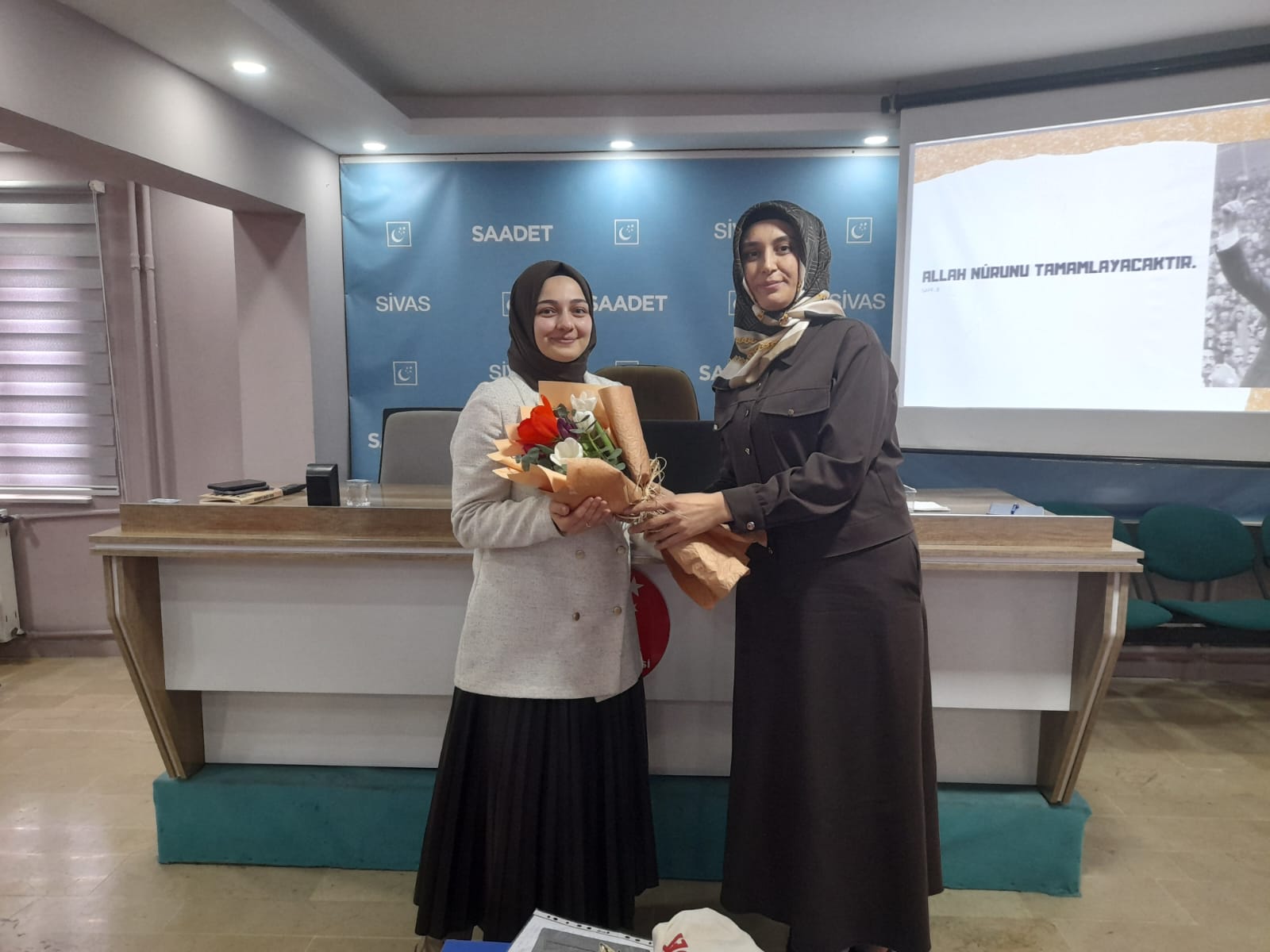 Saadet Partisi Genel Merkez Kadın Gençlik Kolları Başkanı Merve Tekin Çolak, İl Ziyaretleri kapsamında Sivas’ı ziyaret etti. Ziyaret çerçevesinde "Niçin ve Nasıl Çalışmalıyız" başlıklı eğitim semineri gerçekleştirildi. Eğitimde, teşkilat üyelerine nasıl daha etkili çalışılabileceği, hedefler doğrultusunda nasıl bir strateji izlenmesi gerektiği konularında önemli bilgiler verildi.