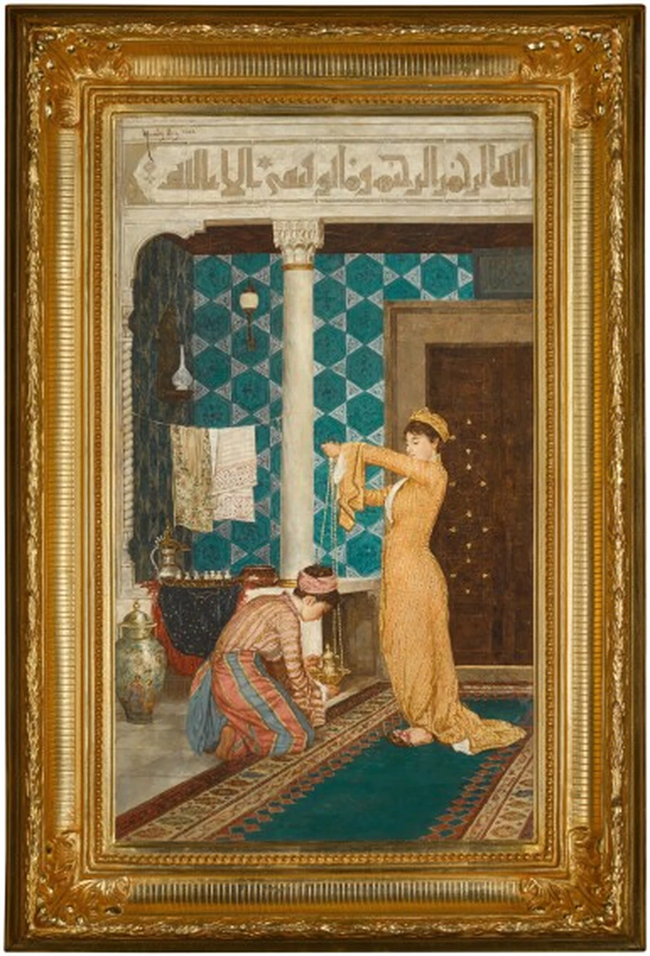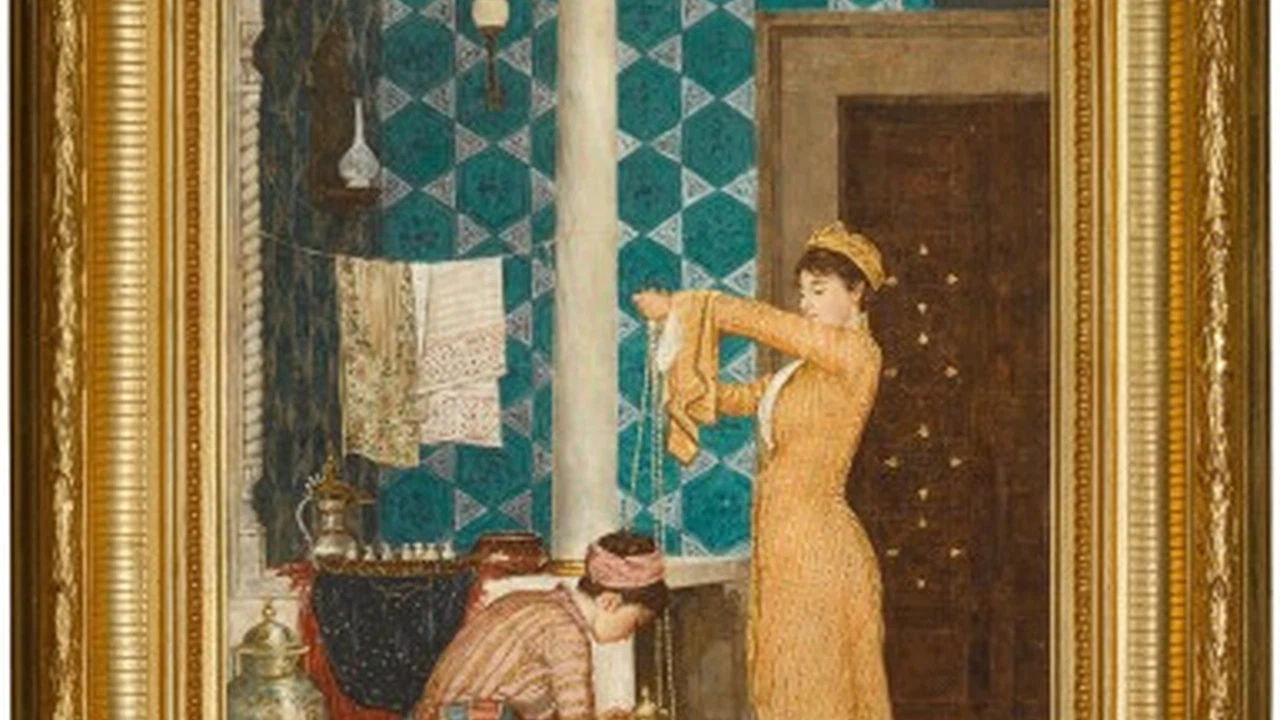 Topkapı Sarayı'nın harem bölümü tasvir edilen tabloda, kahve hazırlayan iki genç kadın betimleniyor.