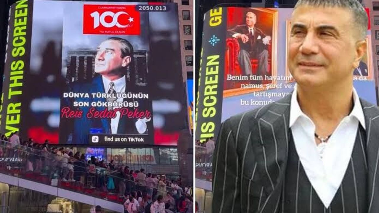 Organize suç örgütü lideri olduğu gerekçesiyle hakkında kırmızı bülten çıkarılan Sedat Peker'in Cumhuriyet'in 100. yıl mesajı, ABD'nin New York şehrinde bulunan Times Meydanı'nda yayınladı. Peker görüntüleri sosyal medya hesabından da yayınladı.