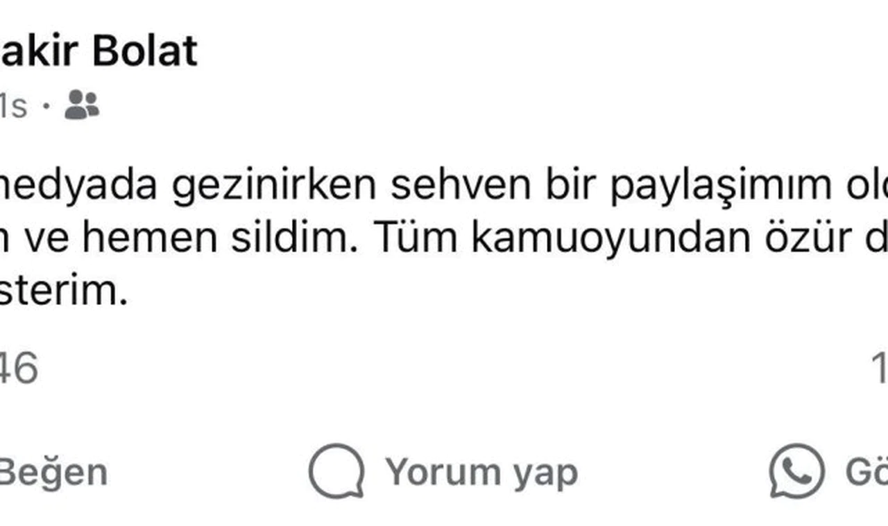Soruşturma başlatılan Bolat ise sosyal medya hesabından, 'Sosyal medyada gezinirken sehven bir paylaşımım olduğunu fark ettim ve hemen sildim. Tüm kamuoyundan özür diler helallik isterim' paylaşımı yaptı.