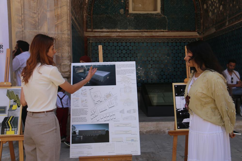 Selçuklu yapılarının detaylarını birebir inceleyerek projelerini geliştirdiklerini belirten Mimarlık Fakültesi 3. sınıf öğrencisi Sena Demirkaya, yapıların simetrik düzeni, sütunlar, eyvanlar ve zarif işlemeleriyle dikkat çektiğini ifade etti. Demirkaya, yapılan çalışmalarda geçmişle gelecek arasında bir köprü kurmaya çalıştıklarını vurguladı.
