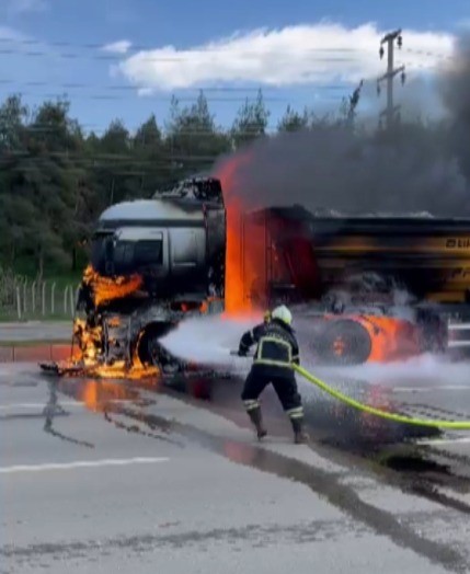 Kahramanmaraş'ta Adana istikametine seyreden bir kamyon, henüz belirlenemeyen bir nedenle alev aldı. Sürücüsünün durumu fark etmesi ve ihbarı üzerine olay yerine gelen itfaiye ekipleri yangına müdahale ederken, kamyonun büyük kısmı yanarak kullanılamaz hale geldi.