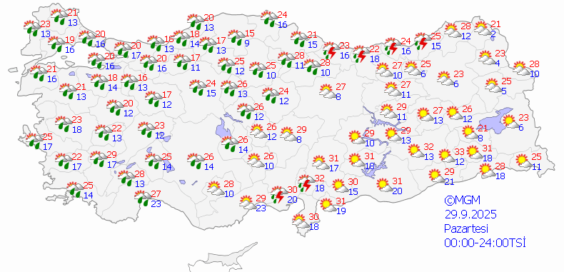 29 Eylül Pazartesi: Parçalı Bulutlu, en yüksek 25°C, en düşük 10°C.