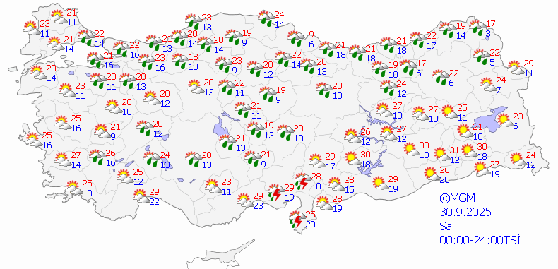 30 Eylül Salı: Parçalı Bulutlu, en yüksek 22°C, en düşük 12°C.