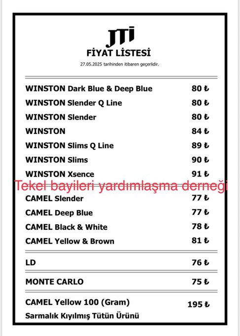27 Mayıs 2025 itibarıyla geçerli olan yeni listeye göre, Winston, Camel ve LD markalarına 3 ila 6 lira arasında zam yapıldı.