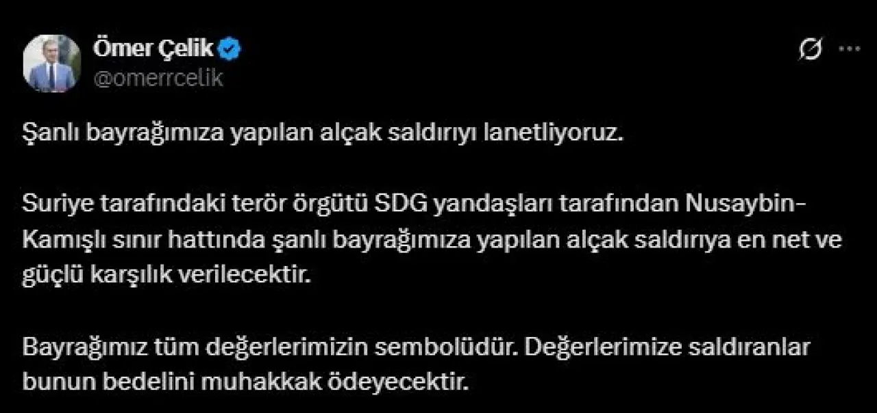 AK Parti Sözcüsü Ömer Çelik, yaşanan bu hadisenin ardından sessizliğini bozarak Türk milletinin hissiyatına tercüman olan bir açıklama yayınladı. Saldırıyı "alçaklık" olarak nitelendiren Çelik, bu tür provokasyonların Türkiye’nin kararlı duruşunu engelleyemeyeceğini belirtti. Çelik, saldırıya verilecek cevabın çok yakın olduğunu işaret ederek, "Suriye tarafındaki terör örgütü SDG yandaşları tarafından Nusaybin-Kamışlı sınır hattında şanlı bayrağımıza yapılan alçak saldırıya en net ve güçlü karşılık verilecektir" ifadelerini kullandı. Bu mesaj, Ankara’nın sınır ötesindeki terör unsurlarına karşı tavizsiz tutumunu bir kez daha ortaya koydu.