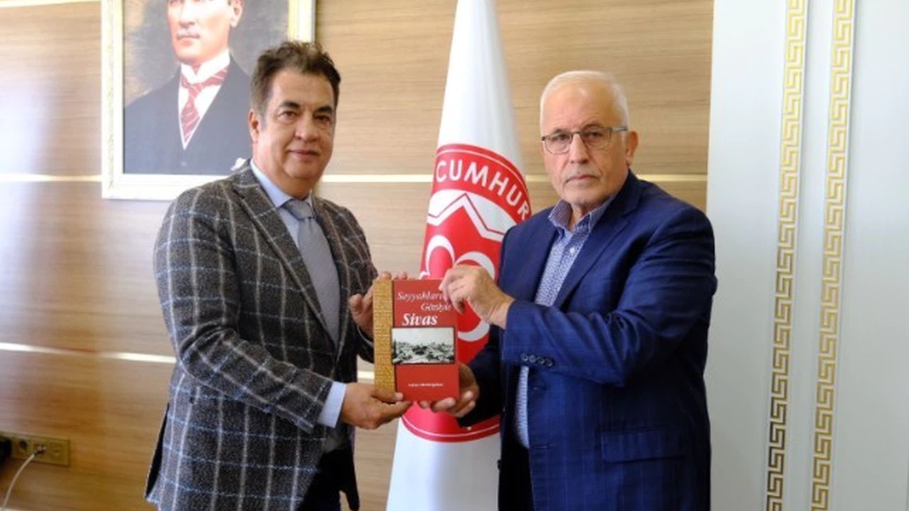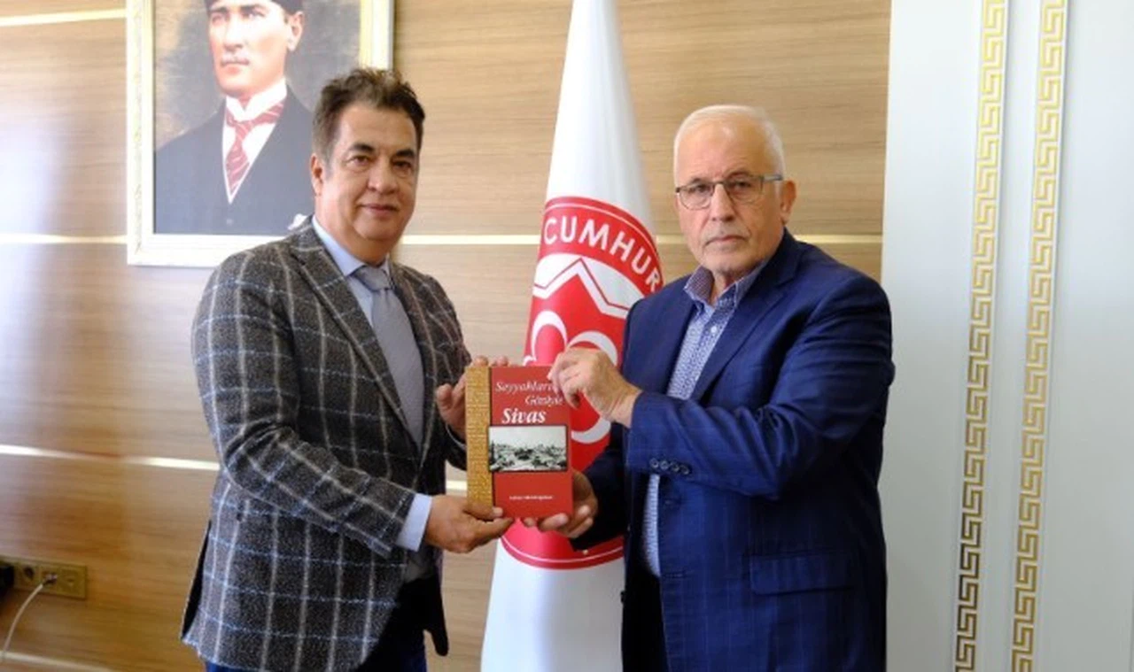 Muhsin Kaya ziyaret ardından Cumhuriyet Üniversitesi Rektörü Prof. Dr. Ahmet Şengönül'e Sivaslılar Eğitim Kültür ve Yardımlaşma Vakfı yayınlarından olan 'Seyyahların Gözüyle Sivas' kitabından hediye etti.