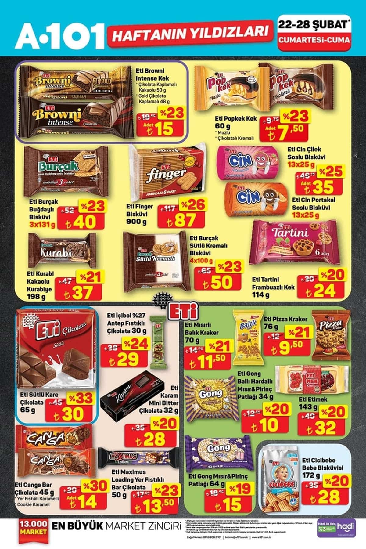 Sivas’taki A101 marketlerinde 22 Şubat 2025 Cumartesi günü itibarıyla birbirinden cazip kampanyalar sizleri bekliyor! A101 Haftanın Yıldızları etiketiyle temel ihtiyaç ürünlerinde büyük indirimler sunulurken, A101 Kampanya avantajlarıyla pek çok ürüne uygun fiyatlarla ulaşabilirsiniz. Üstelik A101 Market mağazalarından, A101 Kapıda uygulamasından, A101 Online platformundan veya A Hadi üzerinden sipariş vererek alışverişinizi kolayca yapabilirsiniz.