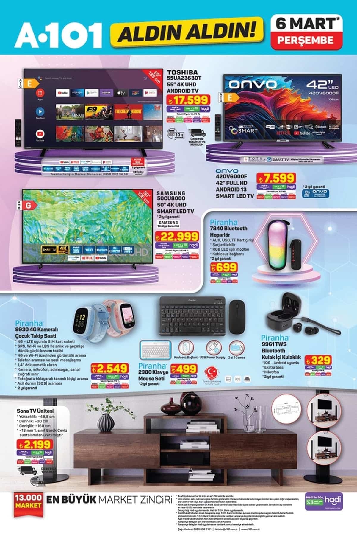 Sivas'taki A101 Marketlerinde, 6 Mart 2025 tarihli Aldın Aldın kampanyasıyla birçok indirimli ürün sizleri bekliyor! Elektronikten beyaz eşyaya, küçük ev aletlerinden tekstil ve mutfak ürünlerine kadar geniş bir yelpazede sunulan fırsatlarla alışveriş keyfi bir başka olacak.