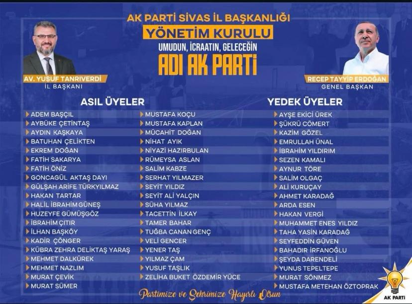 Cumartesi günü 8.Olağan Gebel Kurul Toplantısını gerçekleştiren Sivas AK Parti'de tekrar seçilen Sivas İl Başkanı Yusuf Tanrıverdi, yeni yönetim kurulunu oluşturdu. Buna göre yeni yönetim asıl ve yedek üyeler şu şekilde: Asıl üyeler: Adem Başçıl, Aybüke Çetintaş, Aydın Kaşkaya, Batuhan Çelikten, Ekrem Doğan, Fatih Sakarya, Fatih Öniz, Goncagül Aktaş Dayı, Gülşah Arife Türkyılmaz, Hakan Tartar, Halil İbrahim Güneş, Huzeyfe Gümüşgöz, İbrahim Çıtır, İlhan Başköy, Kadir Çönger, Kübra Zehra Deliktaş Yaraş, Mehmet Dalkürek, Mehmet Nazlım, Murat Çevik, Murat Sümer, Mustafa Koçu, Mustafa Kaplan, Mücahit Doğan, Nihat Ayık, Niyazi Hazırbulan, Rümeysa Aslan, Salim Kabze, Serhat Yılmazer, Seyit Yıldız, Seyit Ali Yalçın, Süha Yılmaz, Tacettin İlkay, Tamer Bahar, Tuğba Canan Genç, Veli Gencer, Yener Taş, Yılmaz Çam, Yusuf Taşlık, Zeliha Buket Özdemir Yüce. Yedek Üyeler: Ayşe Ekici Ürek, Şükrü Cömert, Kazim Gözel, Emrullah Ünal, İbrahim Yıldırım, Sezen Kamalı, Aynur Töre, Salım Olgaç, Ali Kuruçay, Ahmet Karadağ, Arda Esen, Hakan Vergi, Muhammet Enes Yıldız, Taha Yasin Karadağ, Seyfeddin Güven, Bahadır İrfanoğlu, Şeyda Darendeli, Yunus Tepeltepe, Murat Sönmez, Mustafa Metehan Öztoprak.