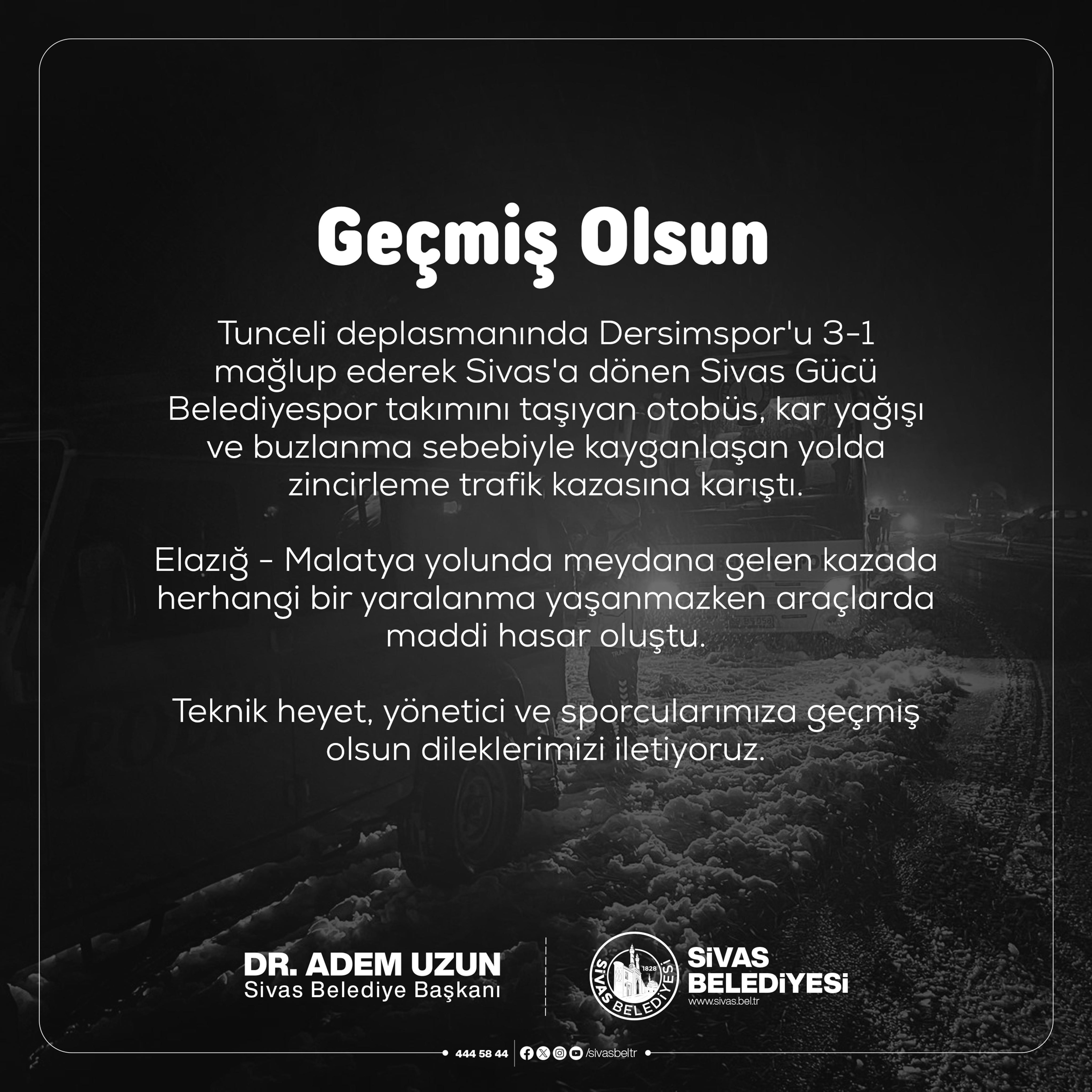 Tunceli deplasmanında Dersimspor'u 3-1 mağlup eden Sivas'ta dönen Sivas Gücü Belediyespor takımını taşıyan otobüsler, kar yağışı ve buzlanma nedeniyle kayganlaşan zincirleme trafik kazasına karıştı.