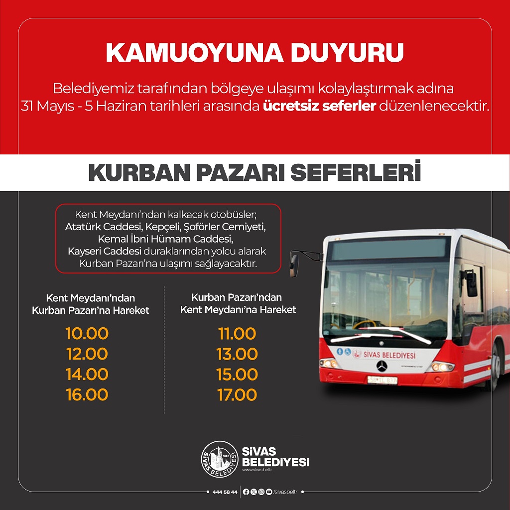 Belediyenin paylaşımında, Kurban Pazarı'na düzenlenecek olan otobüs seferlerinin saat ve güzergahlarının belirlendiği ifade edildi. Vatandaşların mağduriyet yaşamaması ve seferlerden en verimli şekilde faydalanabilmesi için detaylı saat ve güzergah bilgilerinin Sivas Belediyesi tarafından önümüzdeki günlerde ayrıca duyurulması bekleniyor. Sivaslıların belediyenin resmi duyuru kanallarını takip etmeleri önem taşıyor.