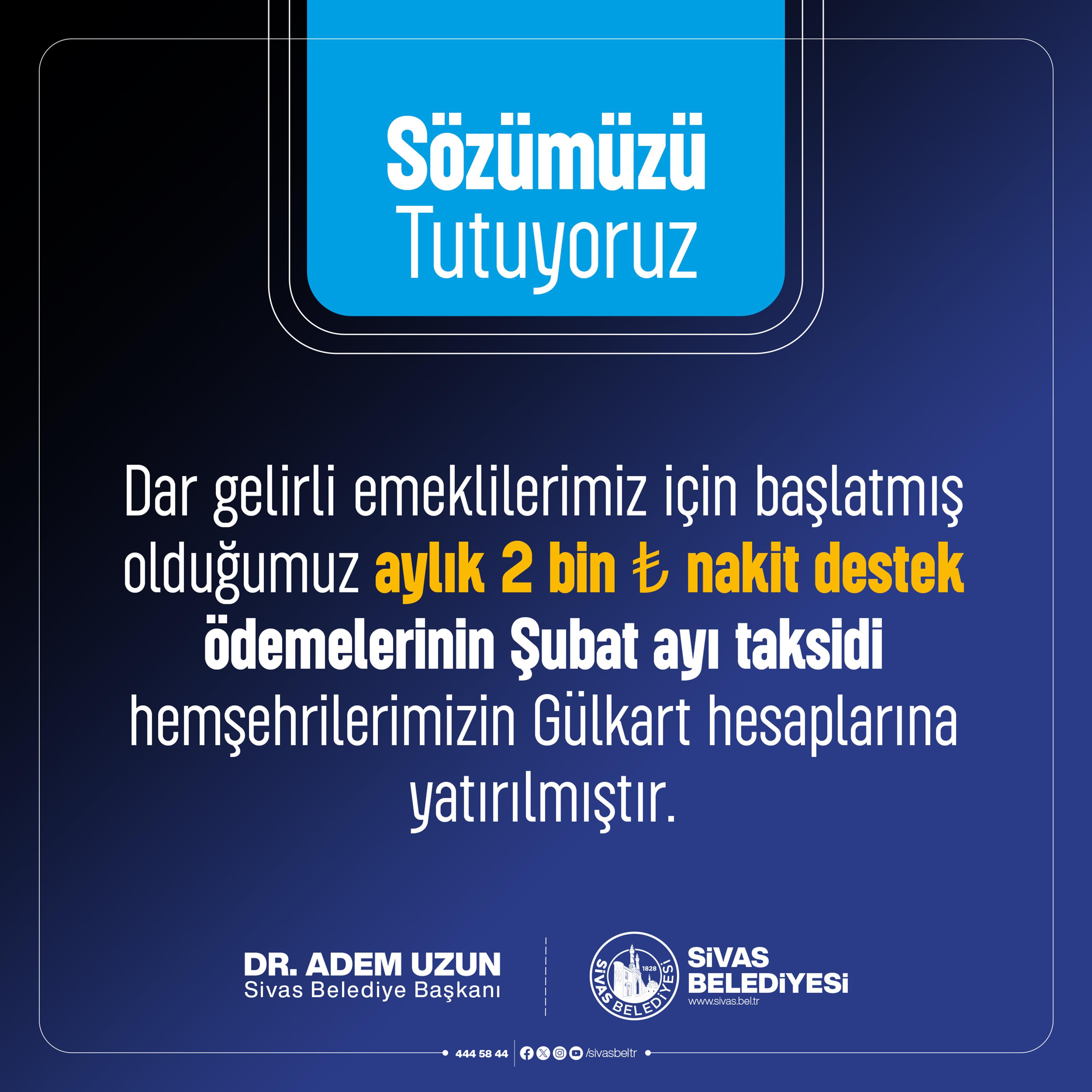 Sivas Belediyesi, dar gelirli emeklilere yönelik başlattığı destek ödemelerini sürdürüyor. Belediye tarafından her ay düzenli olarak sağlanan 2 bin liralık nakit desteğin şubat ayı taksidi, hak sahiplerinin Gülkart hesaplarına yatırıldı.