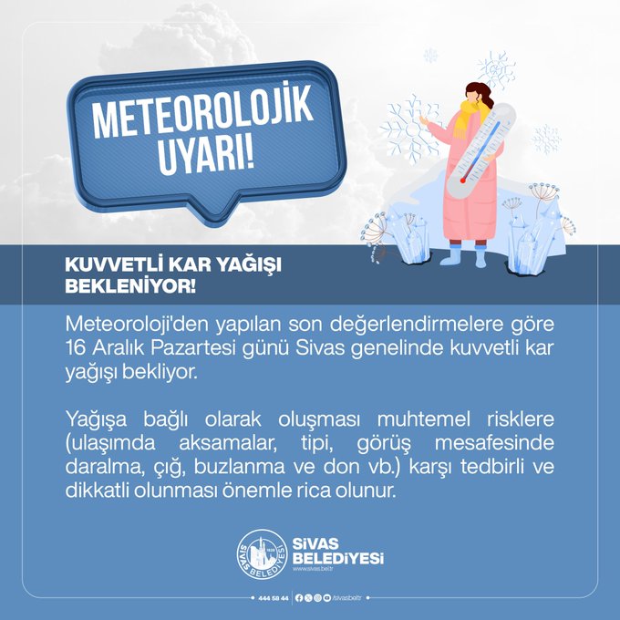 Meteoroloji Genel Müdürlüğü tarafından yapılan son değerlendirmelere göre, 16 Aralık Pazartesi günü Sivas genelinde kuvvetli kar yağışı bekleniyor. Sivas Belediyesi, vatandaşları yağışa bağlı oluşabilecek olumsuzluklara karşı tedbirli olmaları konusunda uyardı.