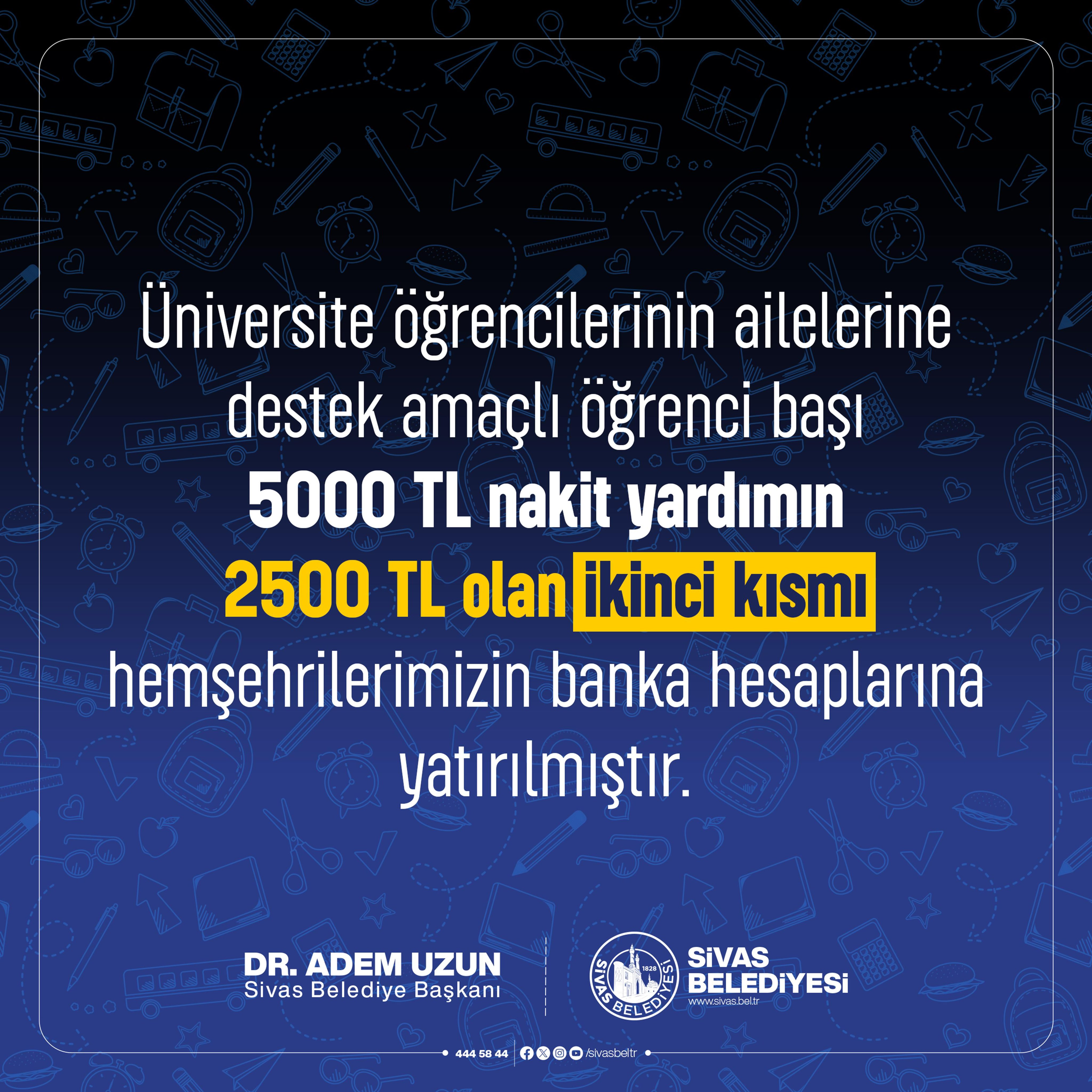 Sivas Belediyesi, dar gelirli ailelerin üniversite eğitimi gören çocuklarına sağladığı 5 bin TL’lik eğitim yardımının ikinci ödemesini gerçekleştirdi. Yardımın 2 bin 500 TL’lik ikinci kısmı, hak sahibi ailelerin banka hesaplarına yatırıldı.