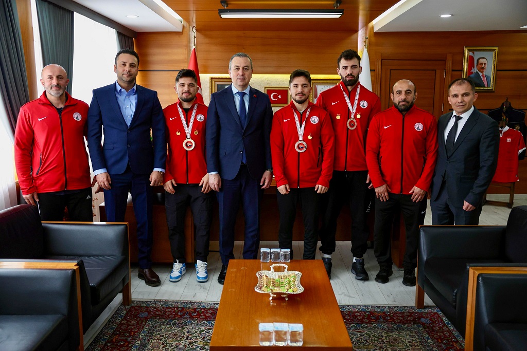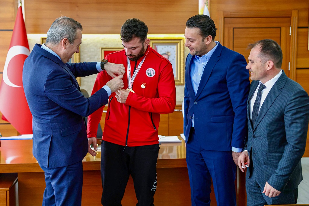 Başkan Adem Uzun, şampiyon güreşçileri makamında kabul ederek tebrik etti. Sporculara başarılarının karşılığı olarak cumhuriyet altını hediye eden Başkan Uzun, genç sporculara desteklerinin devam edeceğini vurguladı.