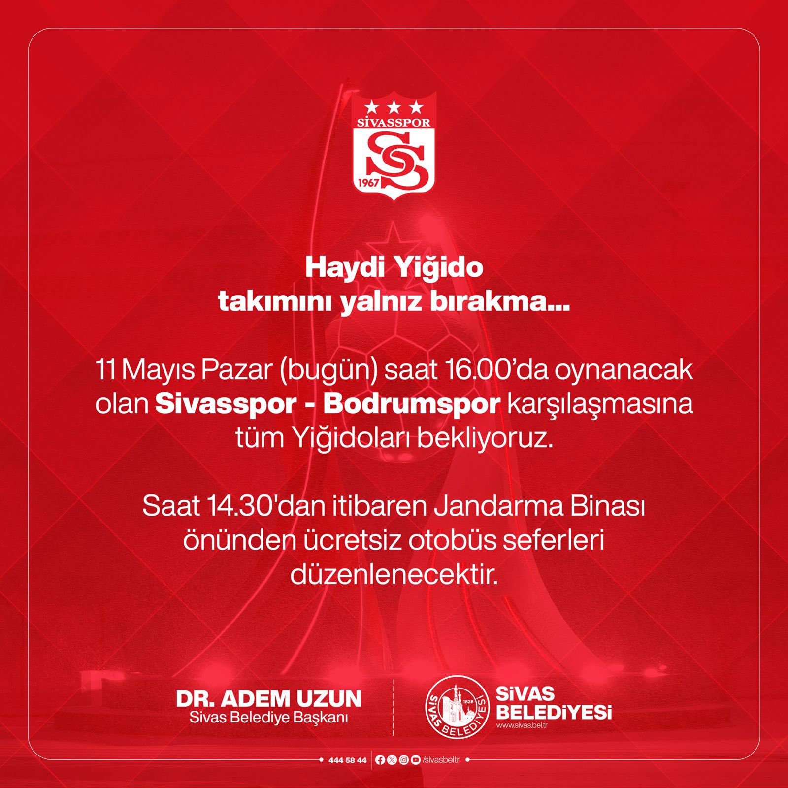 Belediyenin yayınladığı duyuruda, "Haydi Yiğido şimdi destek zamanı..." ifadeleriyle taraftara çağrıda bulunuldu. Maça gitmek isteyen Sivasspor sevdalıları için saat 14.30'dan itibaren Tarihi Jandarma Binası önünden stadyuma kadar ücretsiz otobüsler hareket edecek. Bu uygulama, taraftarların stadyuma kolay ve ücretsiz bir şekilde ulaşımını sağlayarak tribünlerdeki coşkuyu artırmayı hedefliyor.