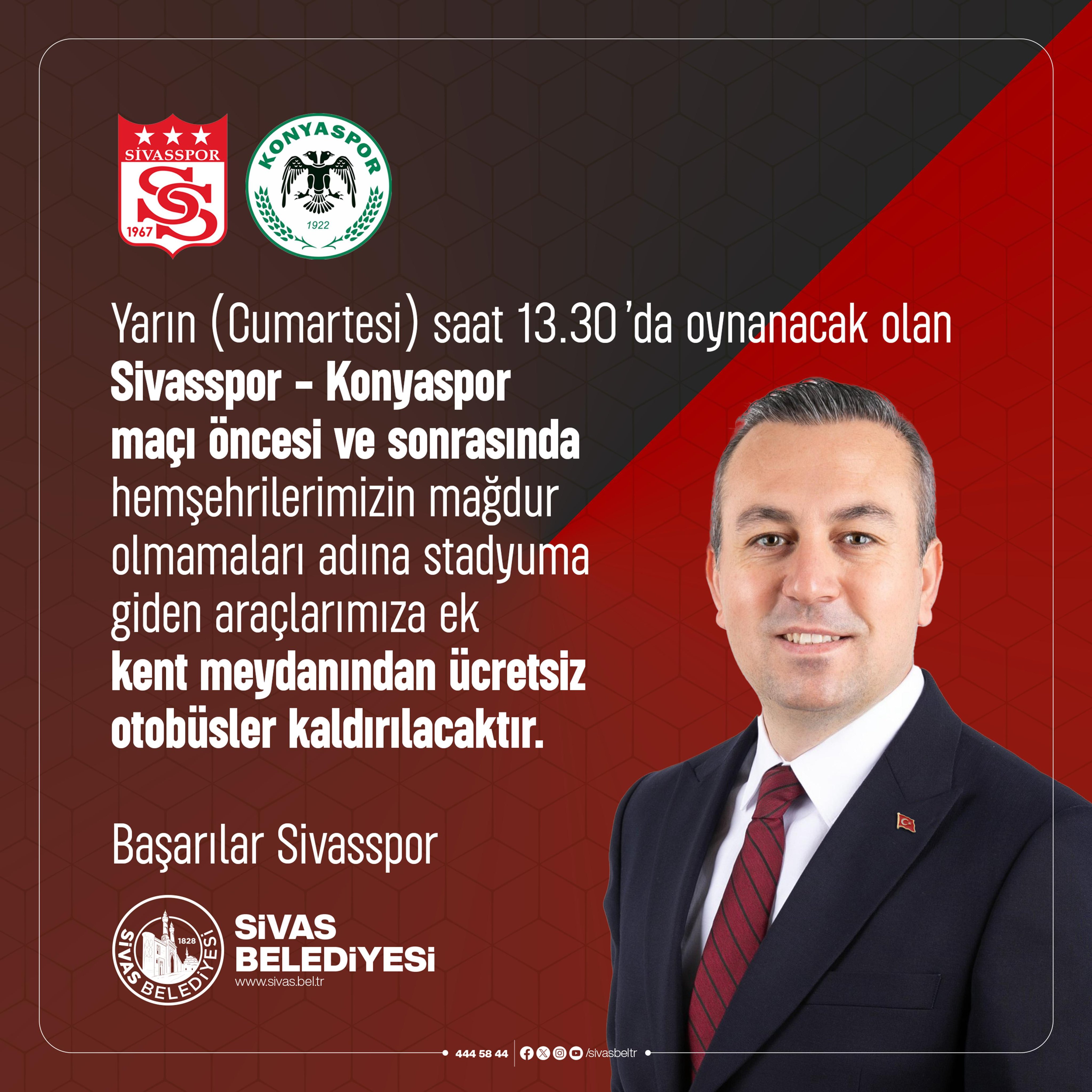 Sivas Belediyesi, bugün saat 13.30'da oynanacak Sivasspor-Konyaspor maçı öncesinde ve sonrasında taraftarların mağdur olmaması için önemli bir adım attı. Maç günü stadyuma ulaşımın kolaylaştırılması amacıyla, kent meydanından stadyuma ücretsiz otobüs seferleri düzenlenecek.