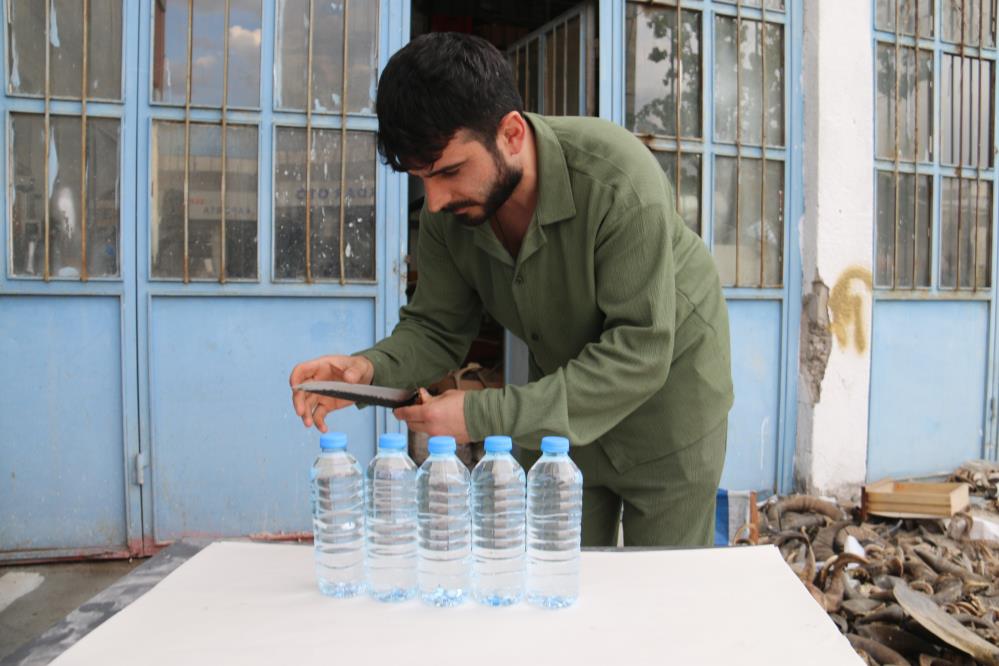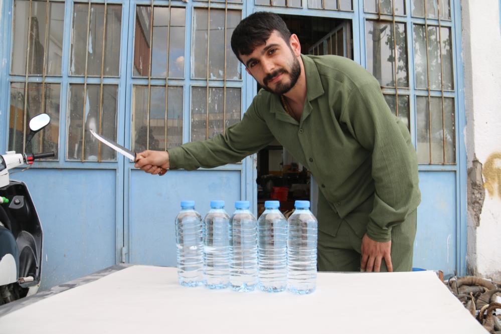 Sivaslı bıçak ustasının pet şişeler üzerinde yaptığı bıçak şovu izleyenleri hayran bırakarak, hem ustalığını hem de Sivas bıçağının kalitesini ortaya koydu.