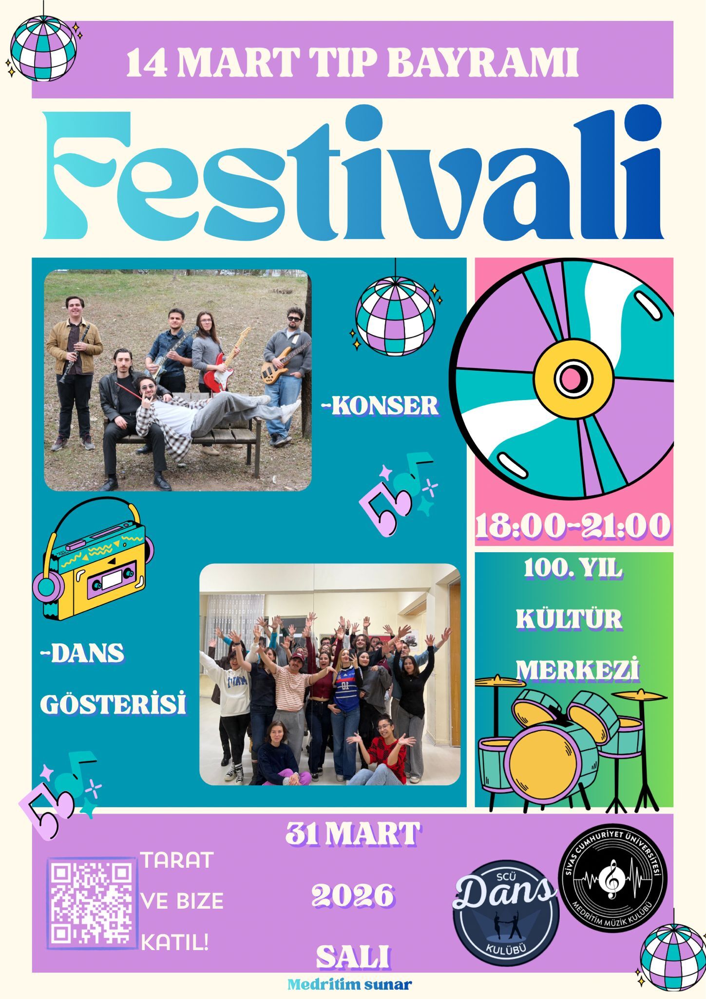 Medritim Müzik Kulübü ile SCÜ Dans Kulübü’nün katkılarıyla hazırlanan program, öğrencilerin sosyal yaşamına hareket kazandırırken aynı zamanda 14 Mart Tıp Bayramı’nın anlam ve önemine dikkat çekecek. Sivas Cumhuriyet Üniversitesi 14 Mart Tıp Bayramı festivali, özellikle gençlerin yoğun ders temposuna kısa bir mola vermesine imkân sunacak.
