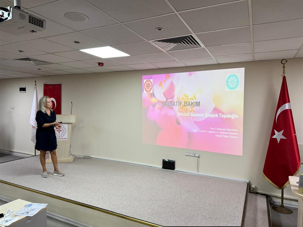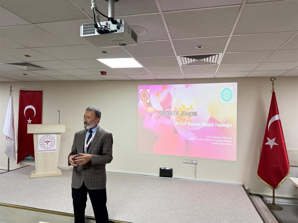 Sivas Devlet Hastanesi Konferans Salonu’nda, Cumhuriyet Üniversitesi Hastanesi’nden Prof. Dr. Sinan Gürsoy ve Uzman Hemşire Yasemin Şimşek Topaloğlu’nun katılımıyla “Palyatif Bakım Hizmetleri Eğitimi” gerçekleştirildi.