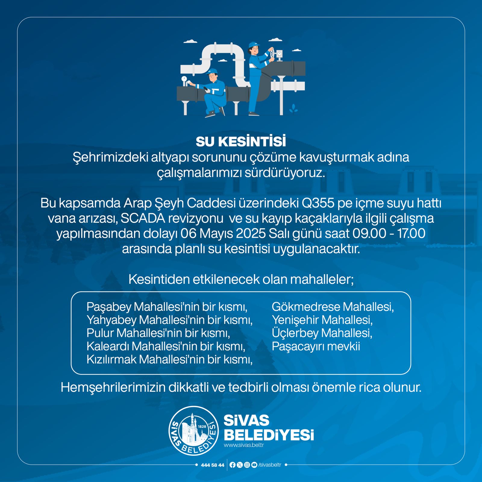 Sivas Belediyesi yetkilileri, belirtilen mahallelerde ikamet eden vatandaşların kesinti süresince yaşanabilecek olumsuzluklara karşı dikkatli ve tedbirli olmalarını, özellikle su ihtiyaçlarını önceden karşılamalarını önemle rica etti. Çalışmaların planlanan sürede tamamlanması için ekiplerin aralıksız görev yapacağı bildirildi.