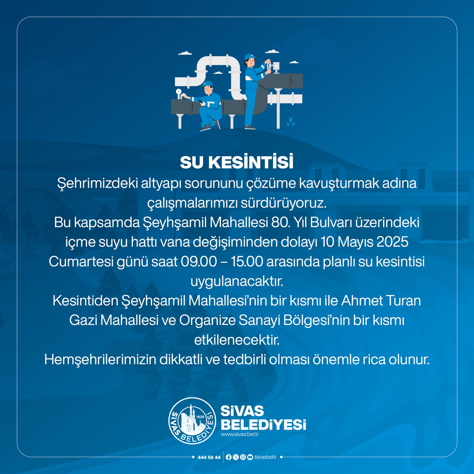 Sivas Belediyesi, şehirdeki altyapı sorunlarını çözüme kavuşturmak ve içme suyu hatlarında önemli bir yenileme çalışması yapmak amacıyla planlı bir su kesintisi duyurusu yaptı. Yapılan açıklamaya göre, Şeyhşamil Mahallesi 80. Yıl Bulvarı üzerindeki içme suyu hattı vana değişimi nedeniyle 10 Mayıs 2025 Cumartesi günü sabah saat 09.00 ile öğleden sonra 15.00 arasında belirtilen bölgelerde su kesintisi yaşanacak.