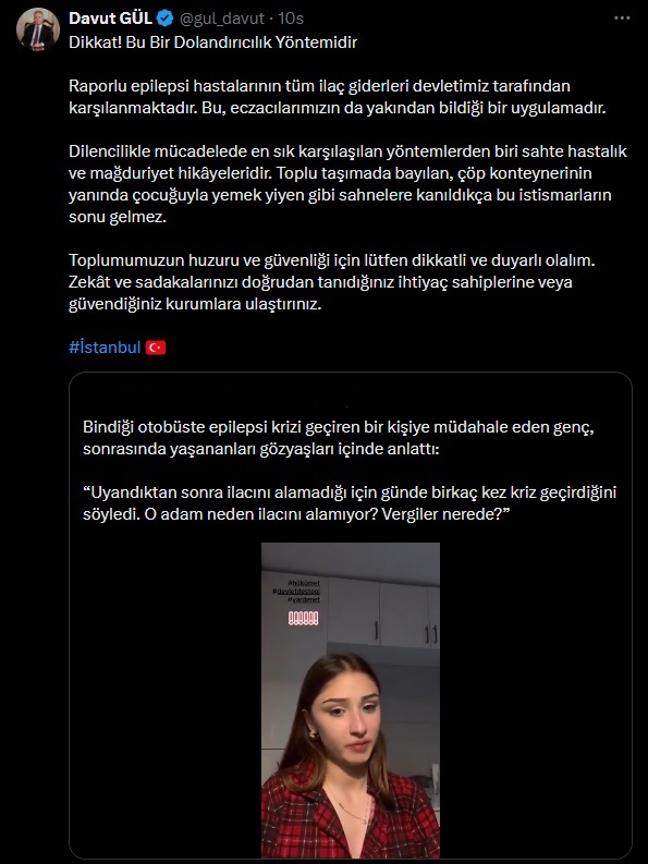Özellikle "epilepsi hastasıyım, ilaçlarımı alamıyorum" diyerek para isteyen kişilere karşı vatandaşları ikaz eden Gül, çok önemli bir gerçeği hatırlattı: "Raporlu epilepsi hastalarının tüm ilaç giderleri devletimiz tarafından karşılanmaktadır. Bu, eczacılarımızın da yakından bildiği bir uygulamadır." Bu bilgi, söz konusu bahaneyle para isteyen kişilerin yalan söylediğinin en net kanıtı niteliğinde.