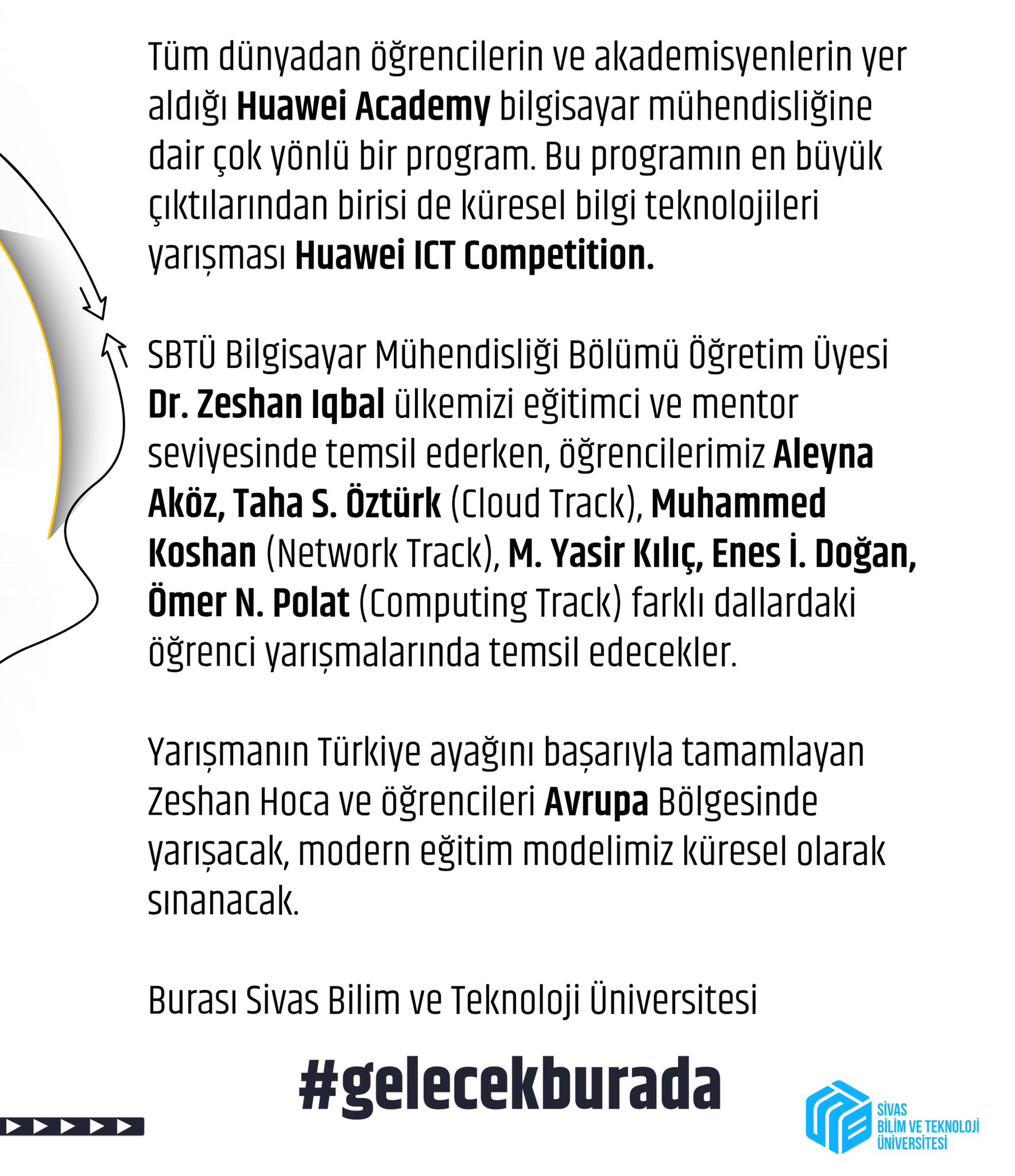 Sivas Bilim ve Teknoloji Üniversitesi (SBTÜ) Bilgisayar Mühendisliği Bölümü büyük bir başarıya imza atarak Huawei ICT Competition yarışmasının Avrupa Bölgesi finallerinde yarışmaya hak kazandı.
