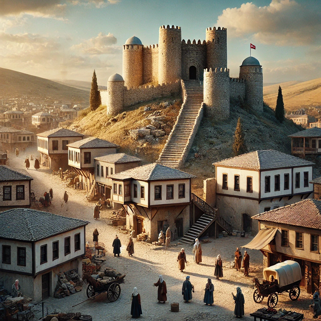 Bir şehri koruyan, geçmişin hatıralarını taşırken aynı zamanda gelecekten bir şeyler bekleyen kale… Sivas Kalesi, yapay zekanın tuvaliyle 200 yıl önceki görünümünü yeniden kazandı. Sur duvarları ve kale kapıları, 1800"lerin güçlü yapısını en ince detayına kadar yansıtırken, o dönemdeki insanlar, geleneksel Osmanlı kıyafetleriyle kalenin etrafında atlı arabalarla hareket ediyor. Güneşli bir günün sıcak ışıklarıyla, Sivas Kalesi, bir zamanlar şehri koruyan görkemli bir savunma kulesi gibi yükseliyor.